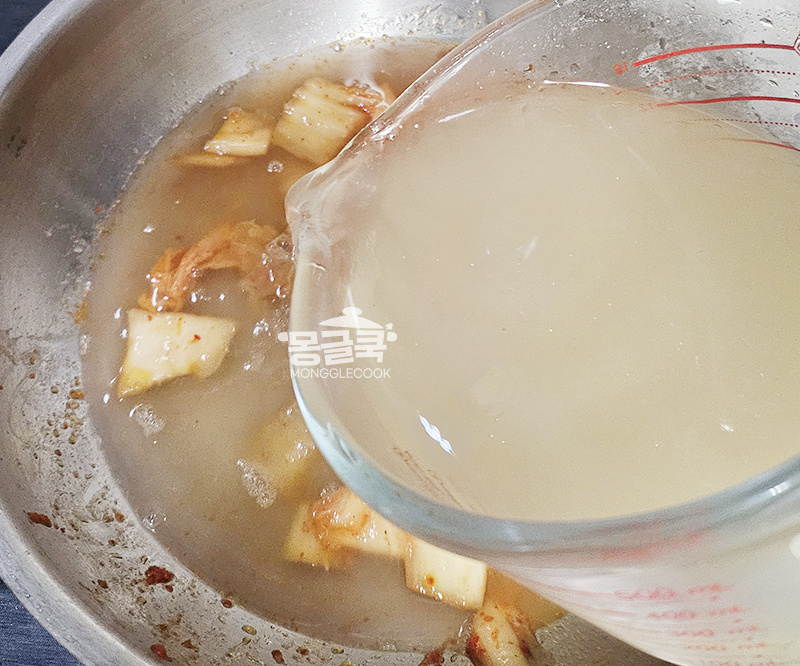 볶아진 김치에 쌀뜨물 또는 코인 육수를 부어주세요.