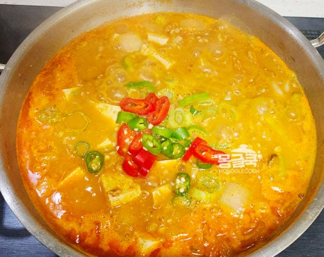 마지막으로 대파, 청양고추, 홍고추를 넣어 1~2분 더 끓여주면 김치 청국장찌개 완성!