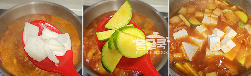 국물이 끓기 시작하면 양파, 애호박(또는 무), 두부를 먼저 넣어주세요.