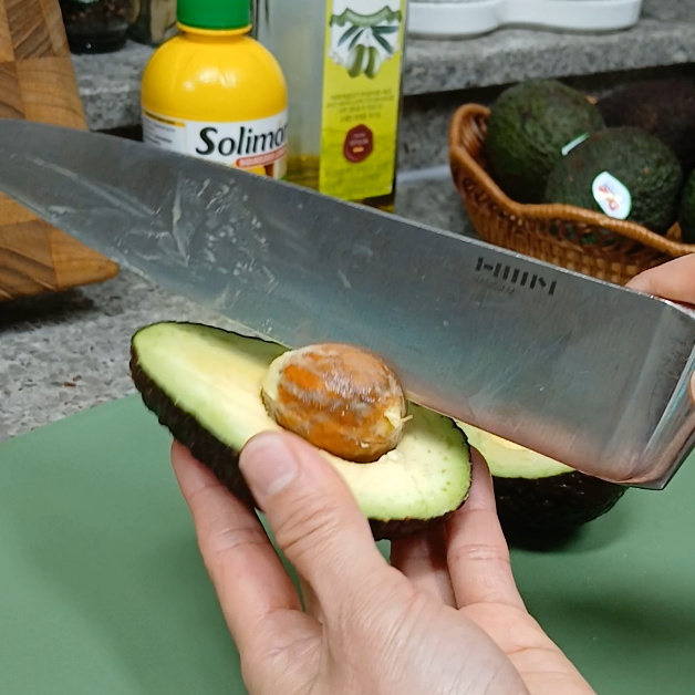 칼로 씨 중간 부분을 가볍게 찍어주면 칼이 아보카도 씨에 콕 박혀요