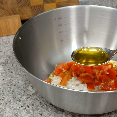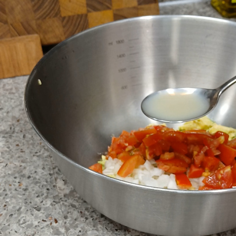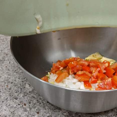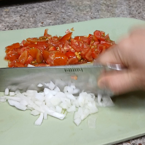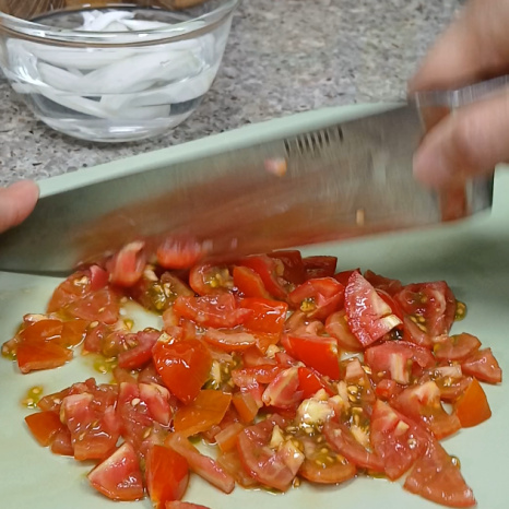 그 사이 깨끗하게 씻은 방울토마토는 잘게 다지듯 썰어주고 물기를 뺀 양파도 토마토와 크기가 비슷하도록 잘게 썰어주세요