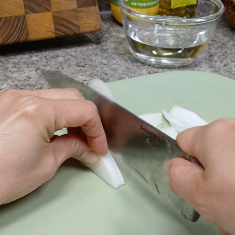 그 다음 칼로 세로로 반으로 깊게 칼집을 내어줍니다