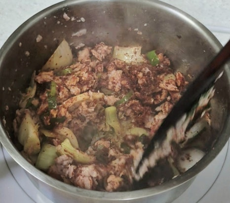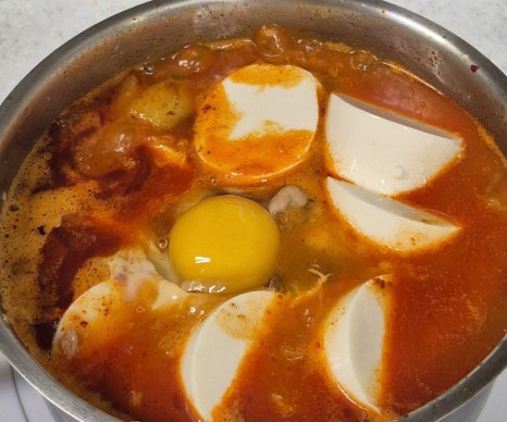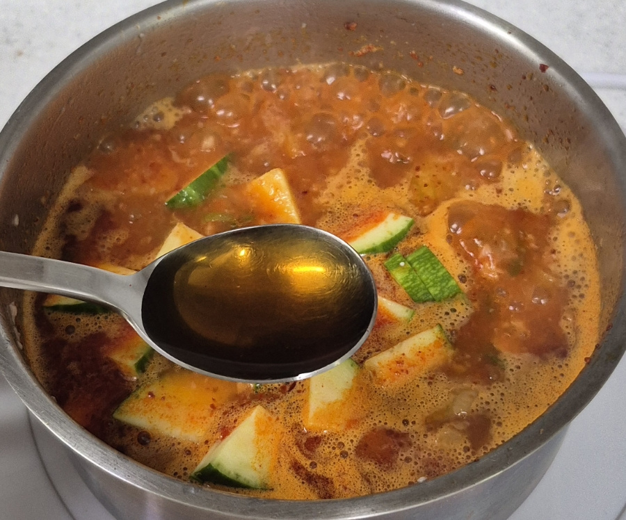 깊고 진한 순두부찌개 양념에 짭조롬하고 감칠맛있는 스팸을 잘게 부숴 넣어 끓이는