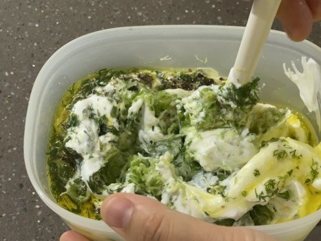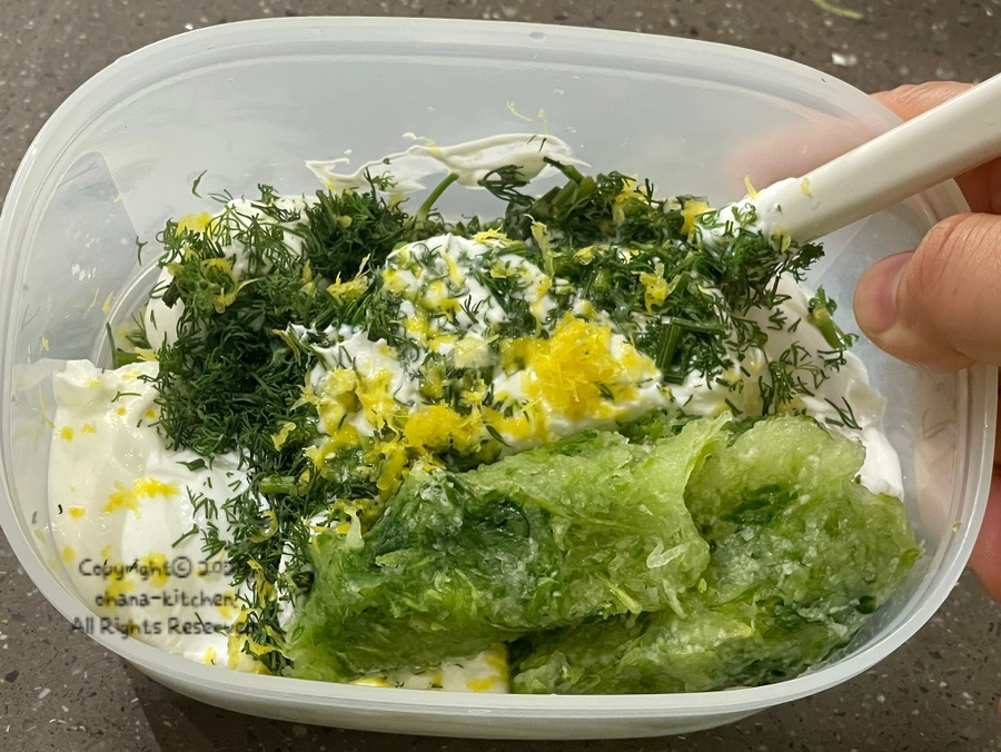 차지키소스는 그리스의 대표 소스 중 하나로 요거트에 잘게 다진 오이, 올리브오일, 마늘, 허브를 넣어 만든 지중해식 대표 소스에요.