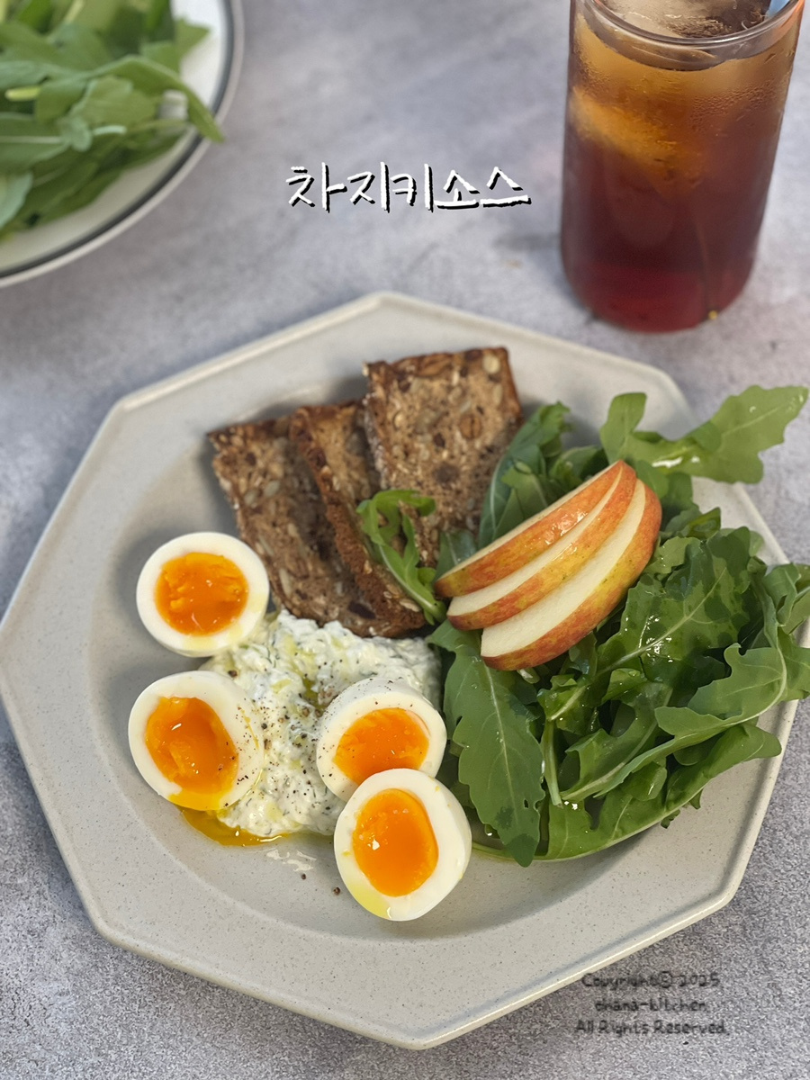 오늘은 오랜만에 차지키소스를 만들어서 아침에 가볍게 먹기 좋은 브런치를 만들어 봤어요.