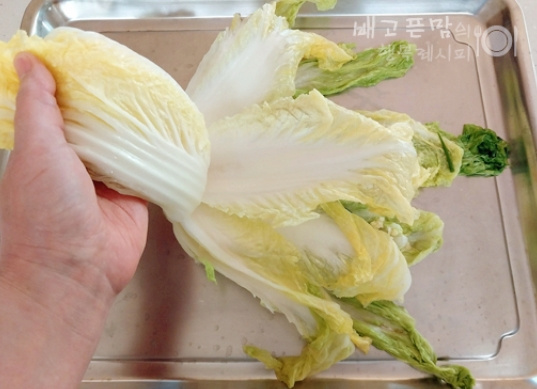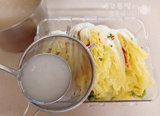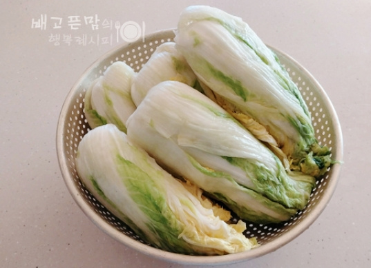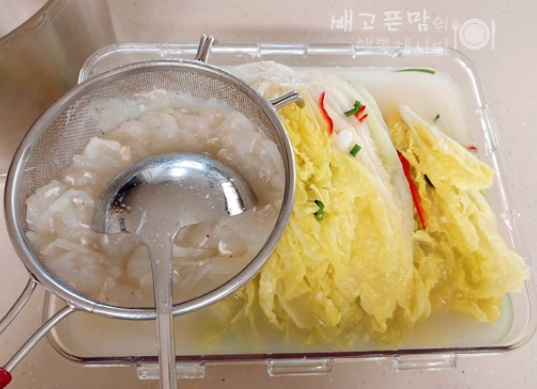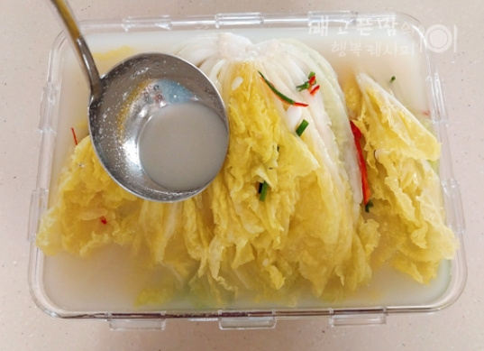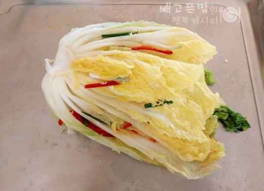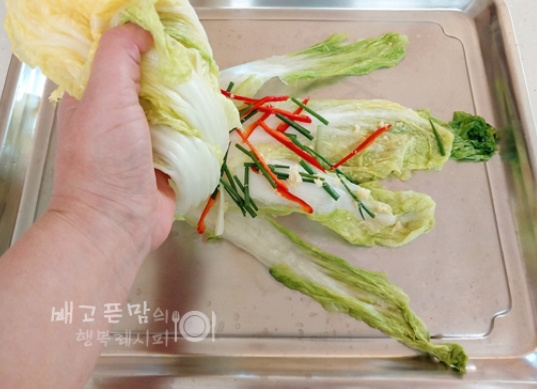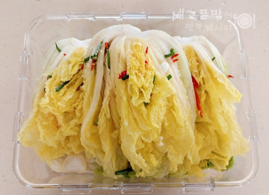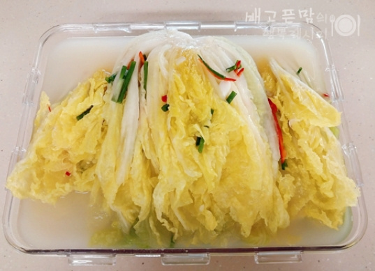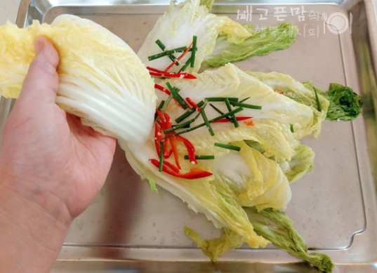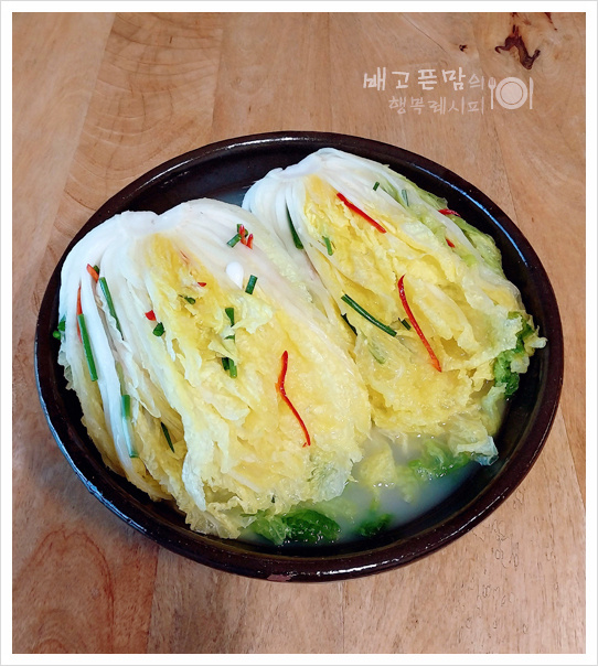 김장하고 남은 절임배추로 배추 물김치 백김치를 담았습니다. 절임배추를 먹기 좋게 잘라 담아도 되겠지만 알배추 모양 그대로 살려 배추 사이에 양념 소를 넣고 찹쌀가루 풀어 끓인 물에 새우젓으로 간을 한 국물을 부어 담근 배추 물김치 냉장고에 시들어가는 배와 절임배추가 있어 간단하게 만들었습니다.