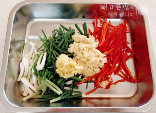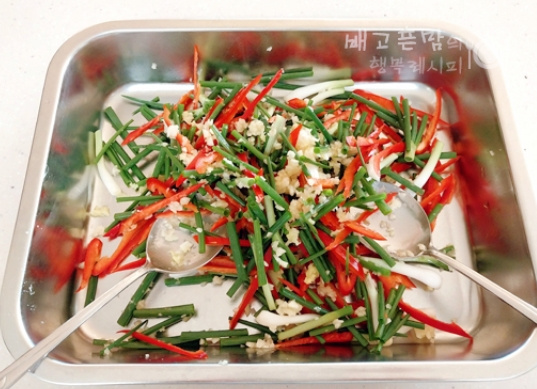 다듬어 씻은 쪽파 단으로 한 줌을 너무 길지 않게 3~4cm 길이로 잘라 줍니다. 마트에서 사 온 크기가 큰 홍고추 3 개를 씻어 길게 반으로 갈라 씨를 제거하고 곱게 어슷하게 썰어 줍니다. 다진 마늘 4 큰 술, 다진 생강 1/2 큰 술을 넣고 고르게 섞어 양념소를 준비해 줍니다.