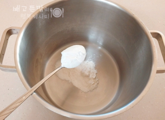 센 불에서 국물이 고르게 팔팔 끓으면 중 불로 줄이고 새우젓 3 큰 술을 넣고 고르게 저어 불을 끄고 식혀 줍니다.