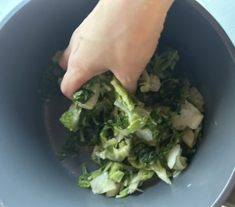 배추잎 완전 겉잎은 우거지로 사용하고 한두겹 안쪽의 초록잎을 따로 모아서 나물 요리로 만들어요.