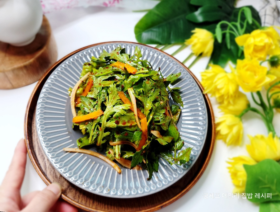 냉장고를 털어서 미나리와 쑥갓을 넣고 같이 샤부작 무쳐 맛을 보니 밥반찬으로도 훌륭하고, 특히 고기를 구워 맛볼때 이만한 효자 반찬이 없는거 같아요.