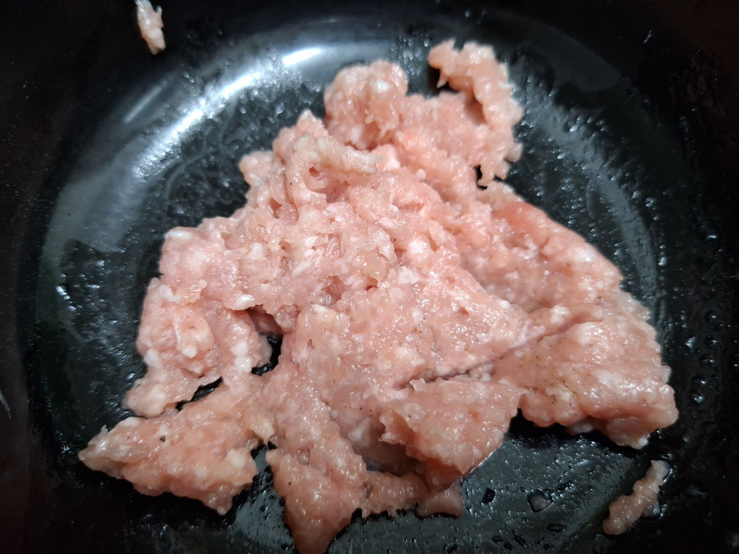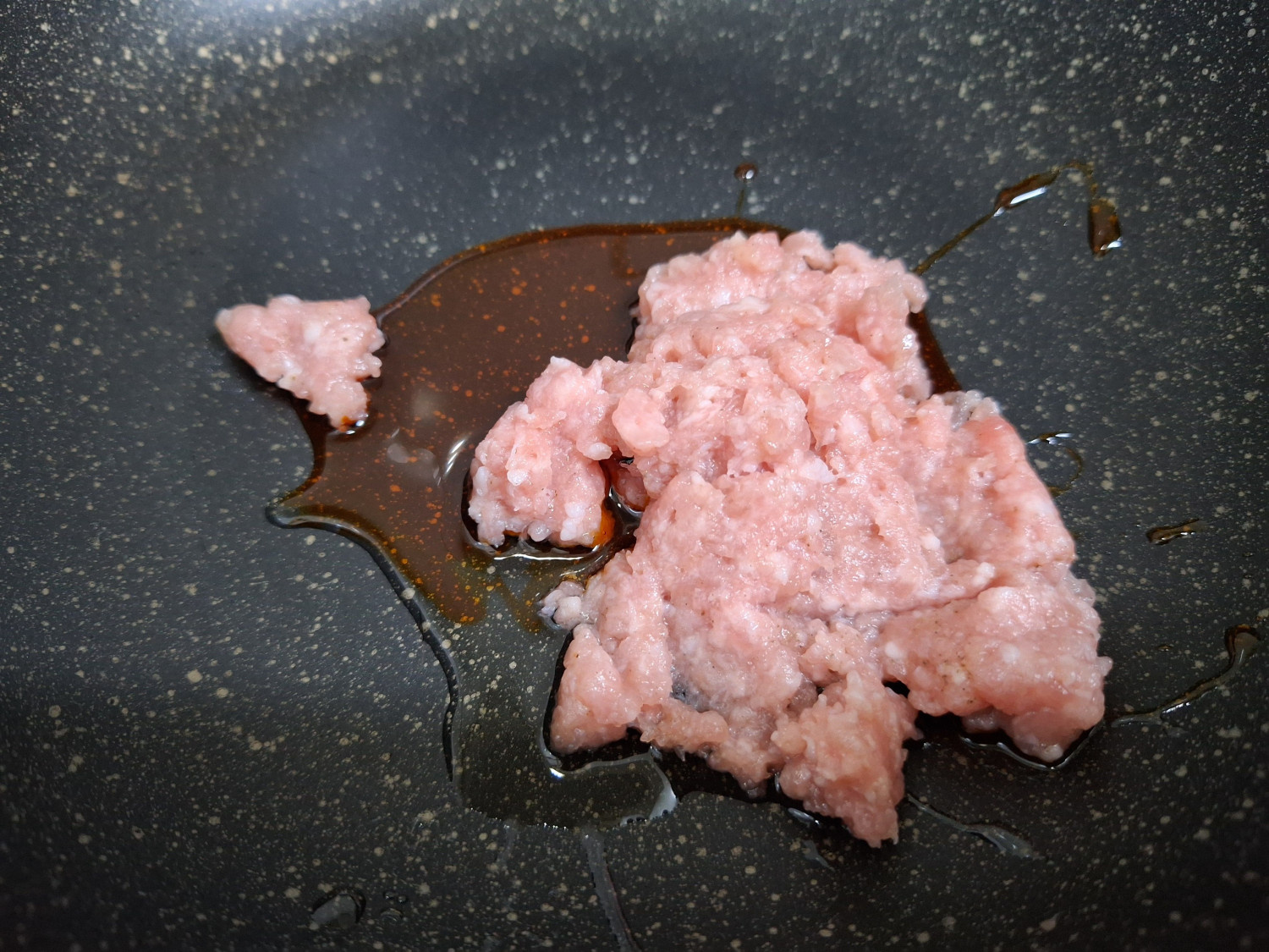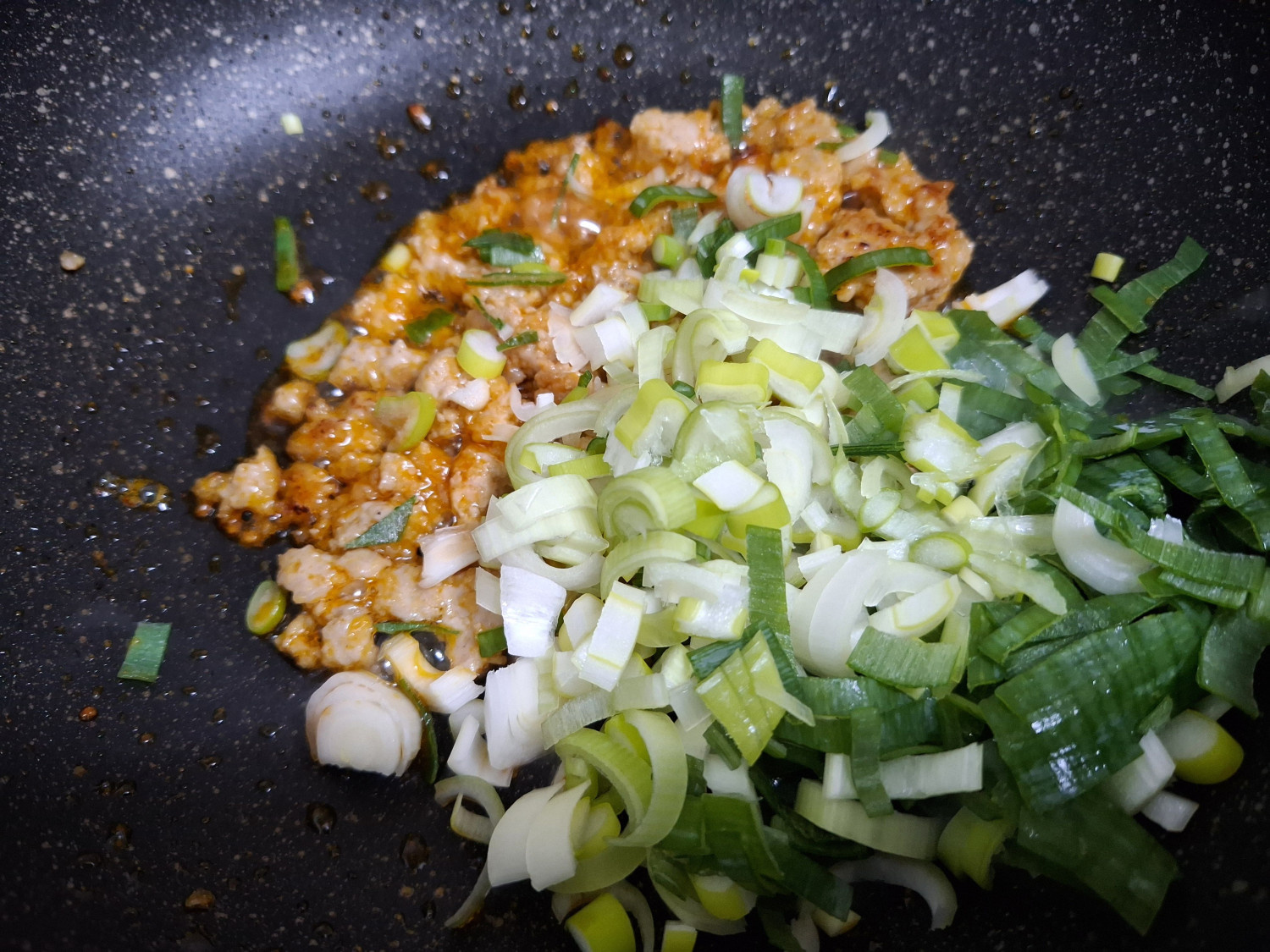 그리고 밑간 해둔 다진돼지고기와 다진 마늘 1숟갈을 넣고