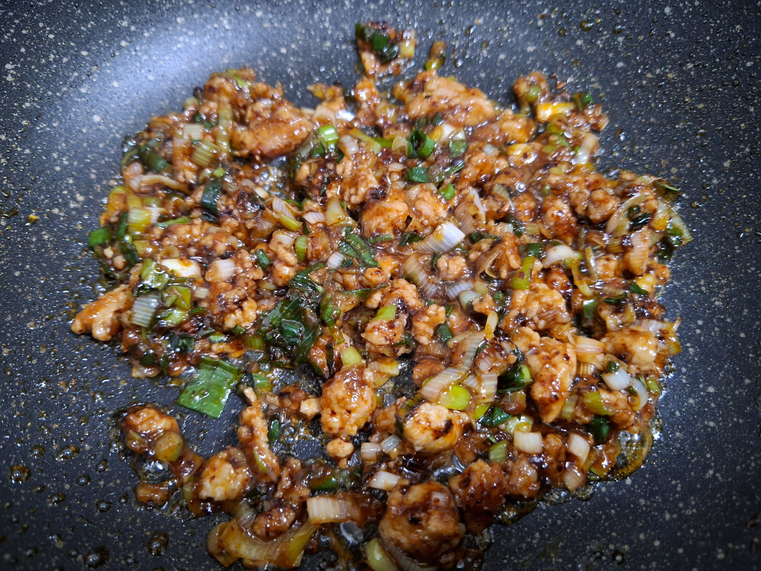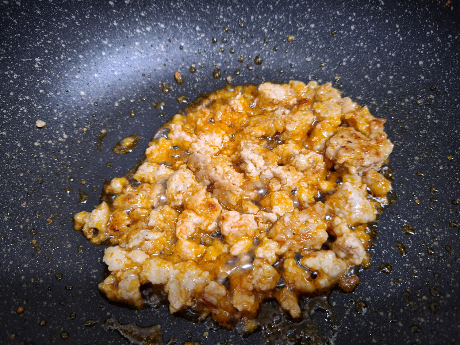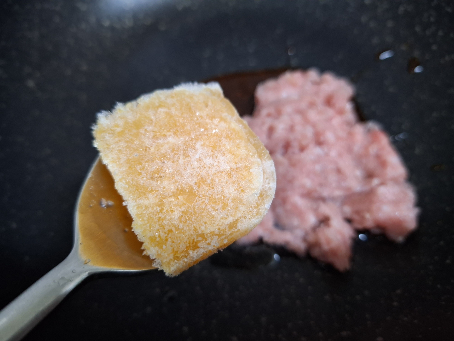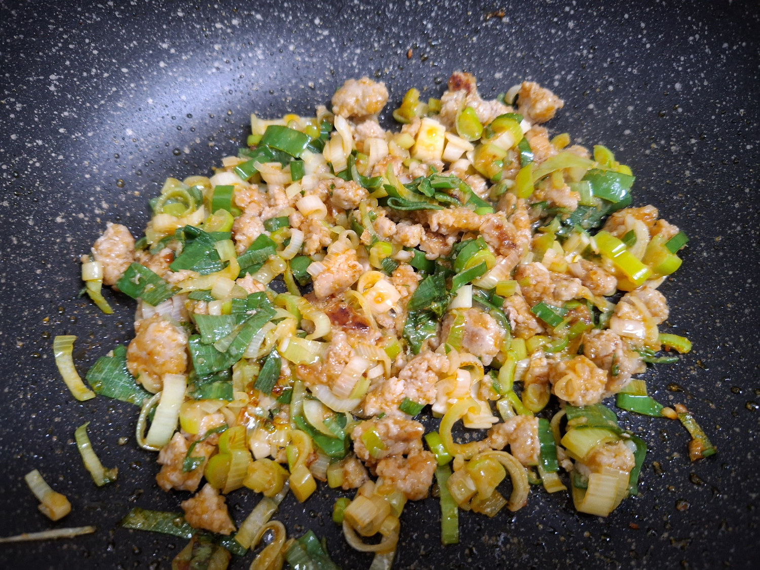 그리고 밑간 해둔 다진돼지고기와 다진 마늘 1숟갈을 넣고