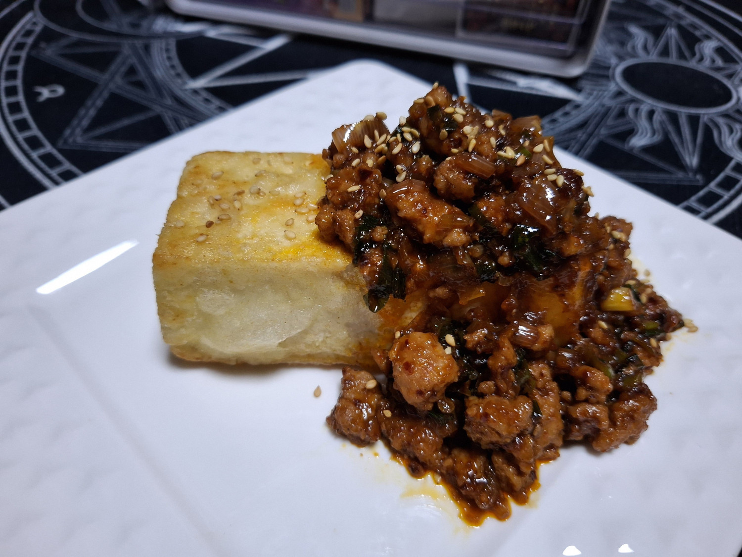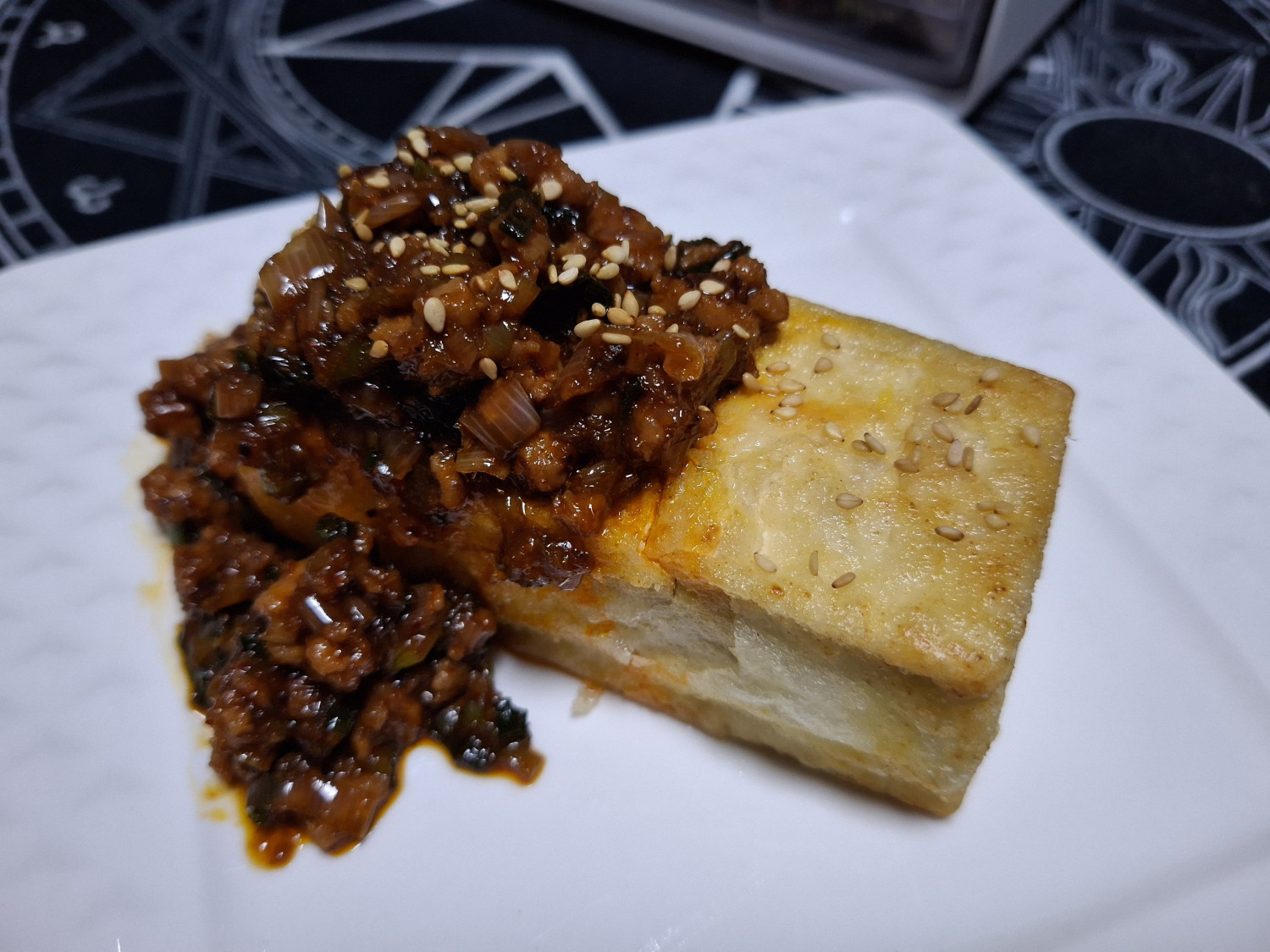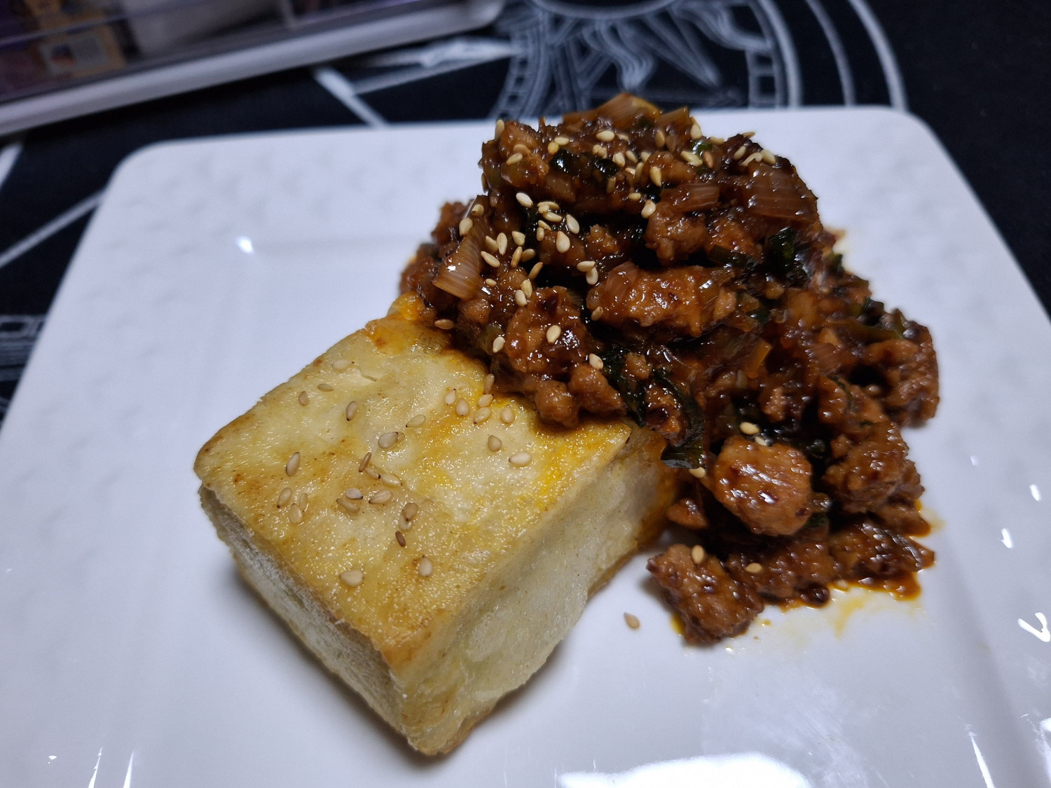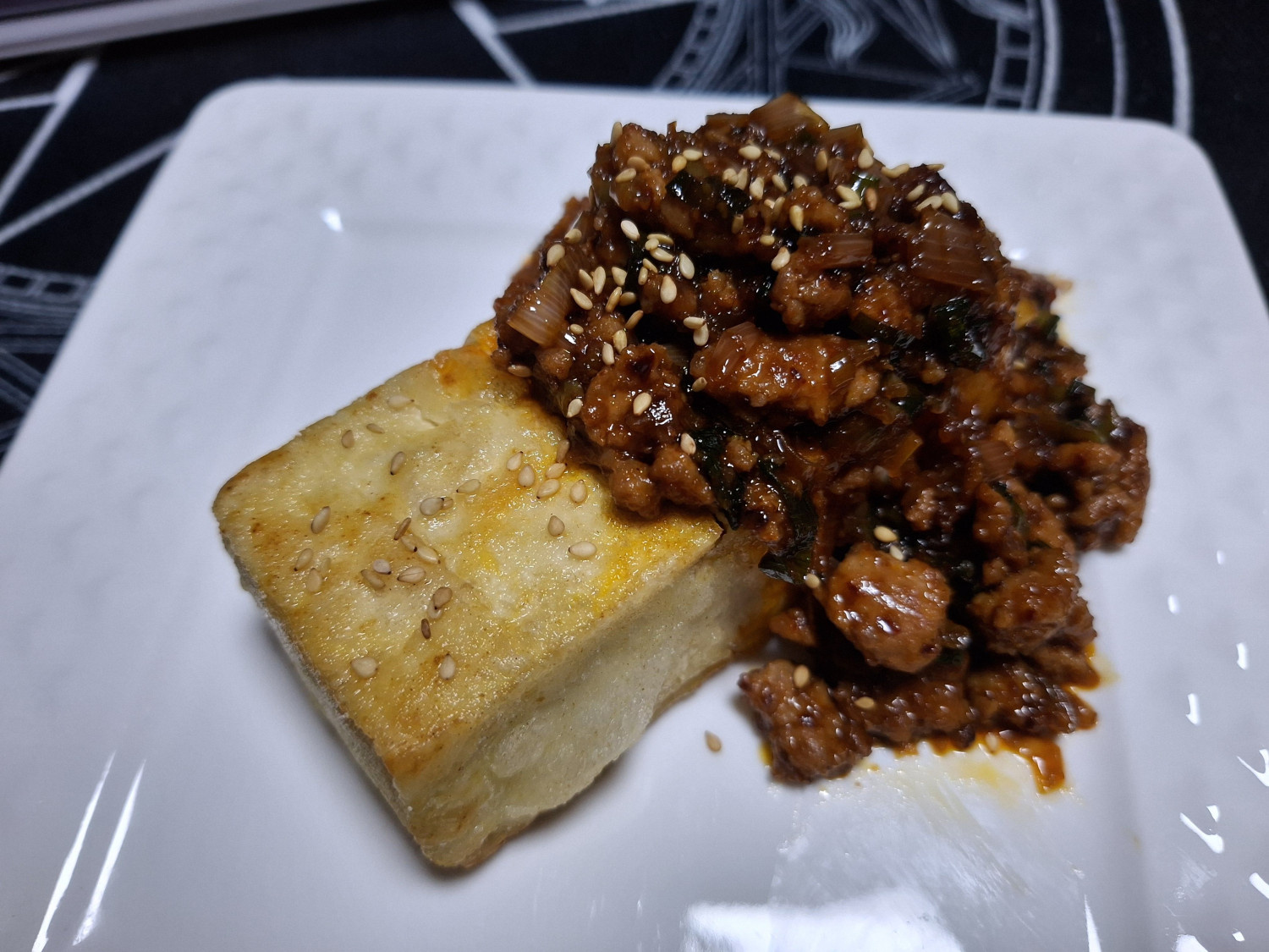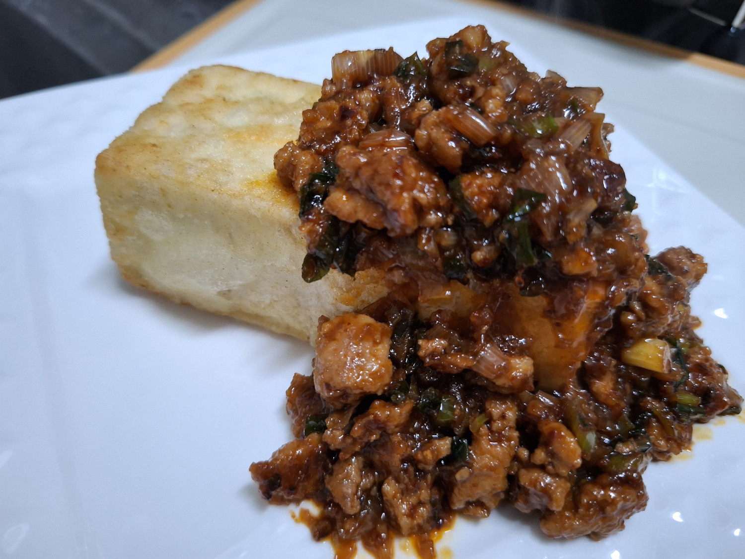 잘 튀겨준 두부를 그릇에 담고 볶아둔 양념장을 듬뿍 올려주세요.