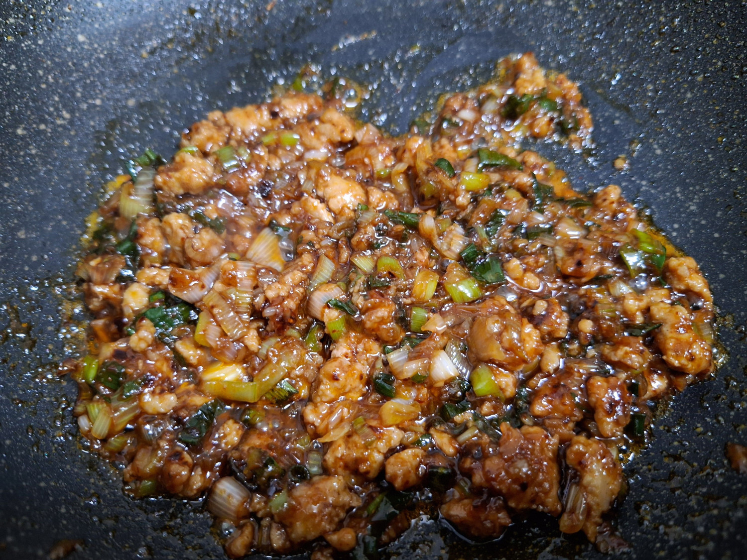 4분 후에 썰어둔 대파를 넣고 1분간 골고루 볶아줍니다.