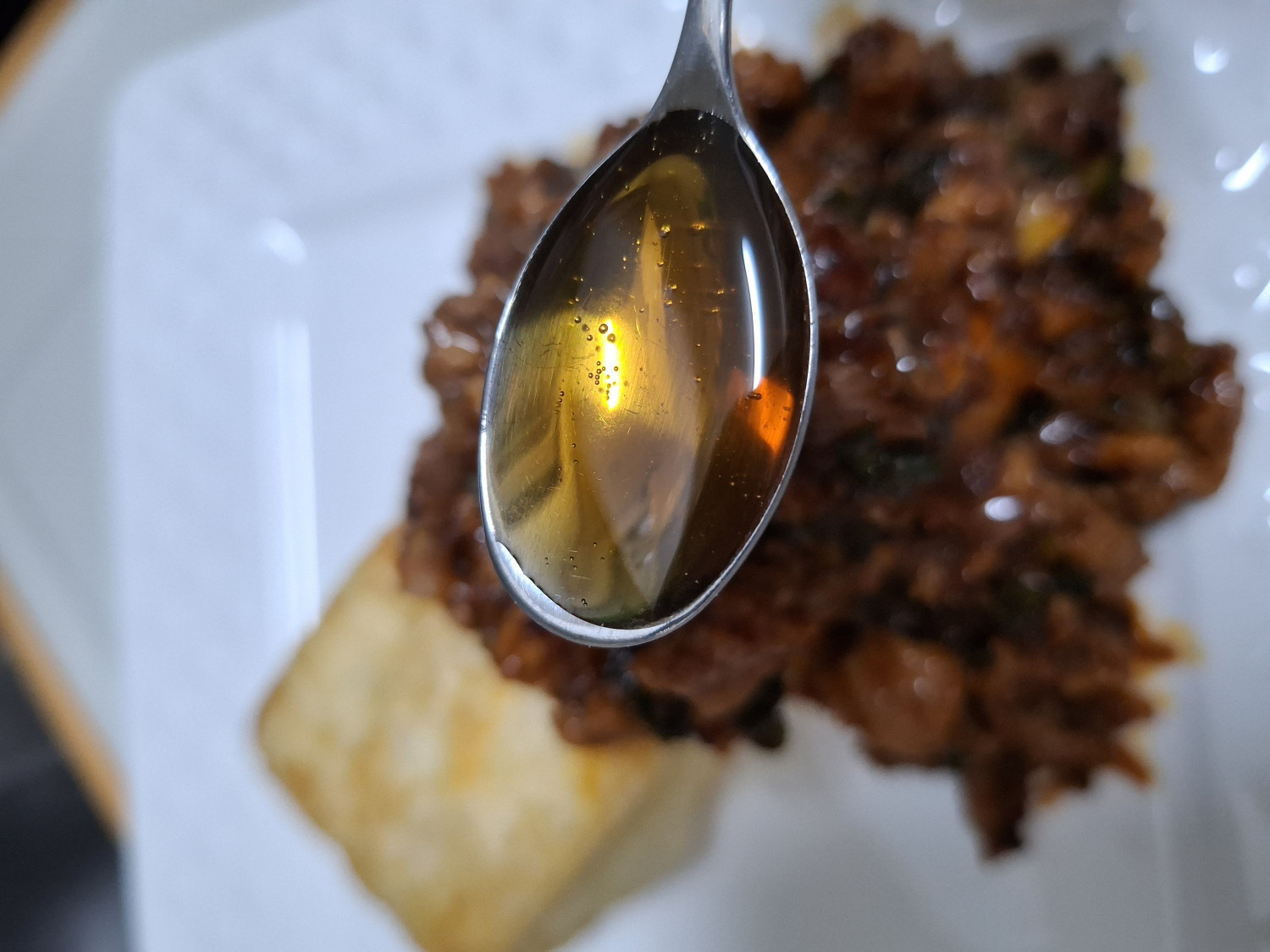 먼저 팬에 식용유 1.5숟갈과 고추기름 1.5숟갈을 부어줍니다.