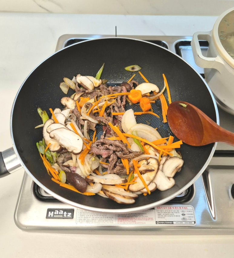 그 다음 잡채용 소고기,간장2T,다진마늘0.5T을 넣고 볶아줍니다