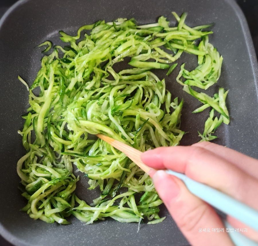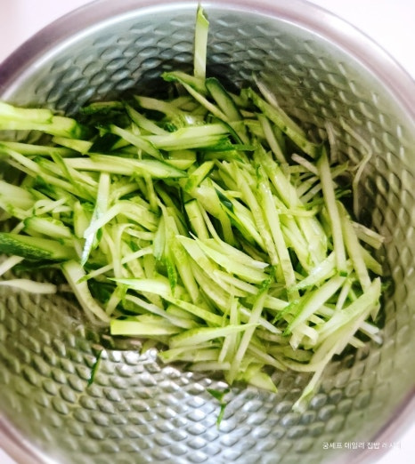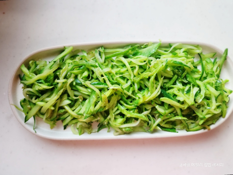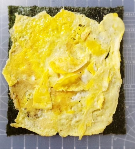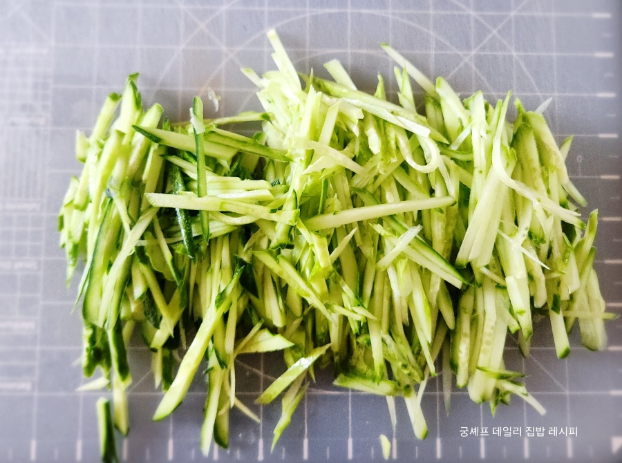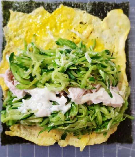밥을 뺀 김밥이라서 김 위에 바로 오이를 올릴수 없어 밥대신 계란 지단을 활용해서 맛과 비주얼을 동시에 해결했어요.