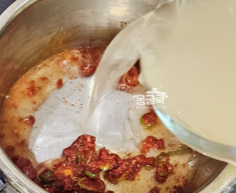 양념이 타지 않게 잘 볶아졌다면 준비한 물 또는 육수를 주세요.