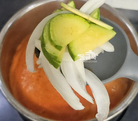 국물이 끓기 시작하면 양파와 애호박을 넣어 2~3분 정도 끓여주세요.