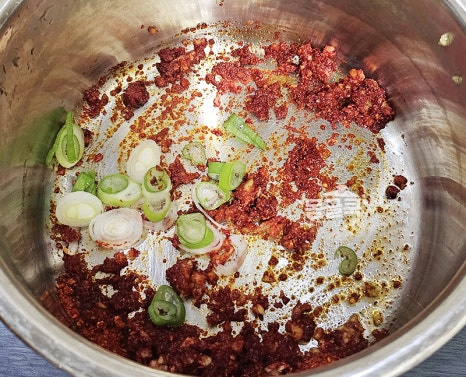 다진 마늘과 고춧가루를 넣어 약불에서 빠르게 볶아 고추기름을 내주세요.