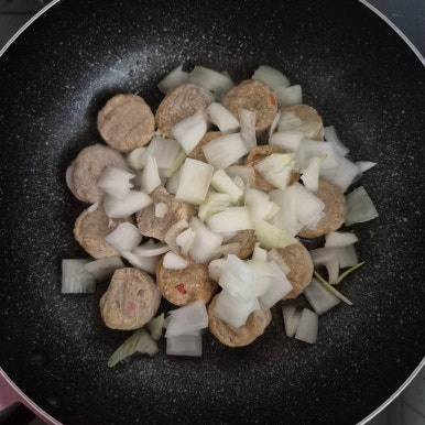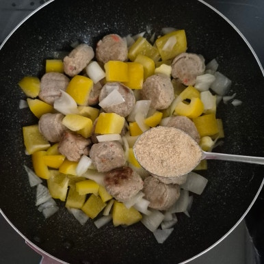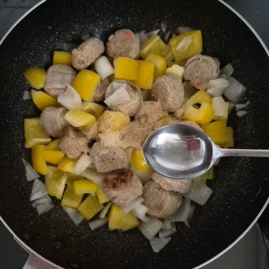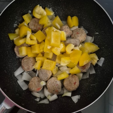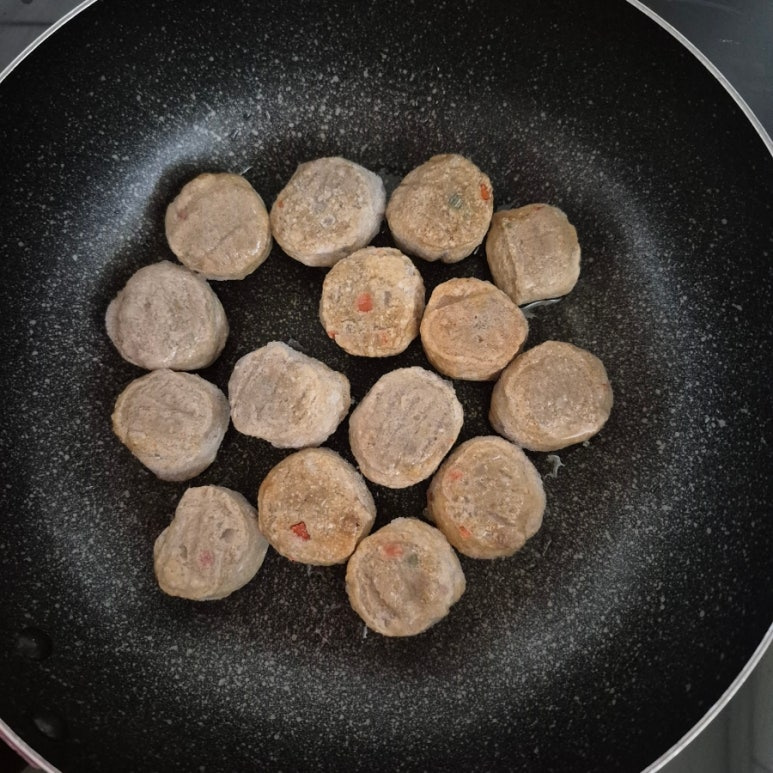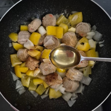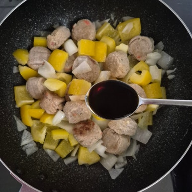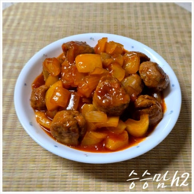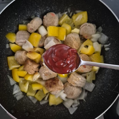 미트볼 200 g , 양파 1/2 개 , 파프리카 1 개 , 올리브 오일 1 큰술 , 케찹 3 큰술 , 간장 1 작은술 , 설탕 1 작은술 , 올리고당 1 큰술 , 물 4 큰술