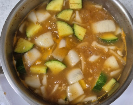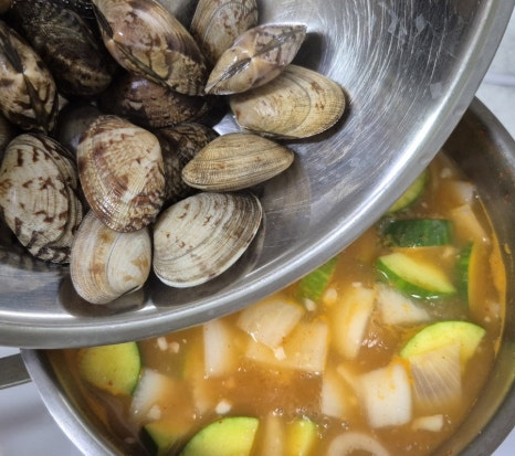 바지락을 오래 끓이면 질겨질 수 있으니 채소를 익힌 뒤 넣어 주세요.