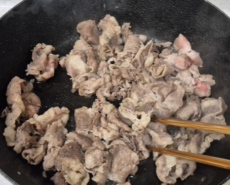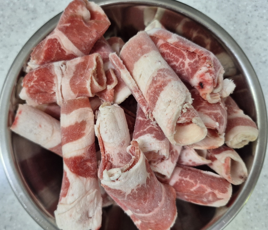 ✔️냉동 우삼겹은 센불에서 볶아야 물기가 많이 생기기 않아요.