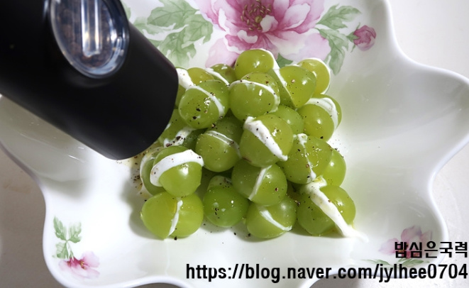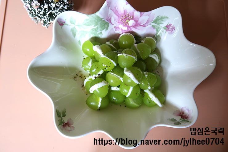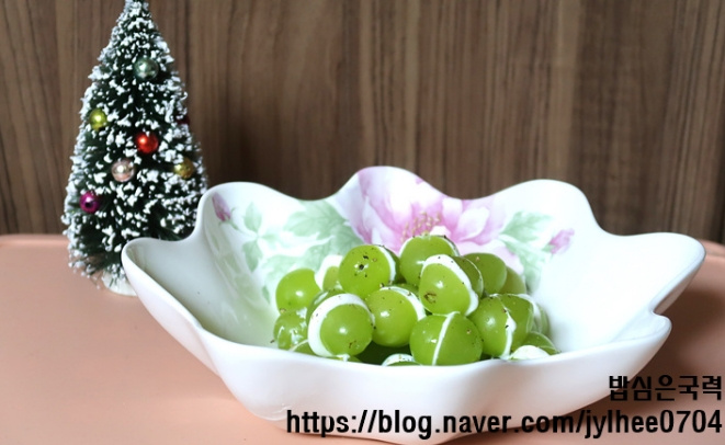 안녕하세요? 밥심은 국력입니다. 초록빛이 통통한 샤인머스켓에 부드 러운 그릭요거트를 샌드하듯 끼워 넣어 만든 아주 간단한 크리스마스 디저트예요. 만들기도 쉽고 플레이팅도 예뻐서 손님상이나 가족들과의 특별한 날 에 딱입니다. 올리브오일과 통후추를 살짝 뿌려 주면 달콤·고소·상큼함이 동시에 살아나는 매력 만점 한입 디저트 가 완성돼요.
