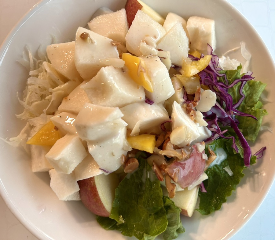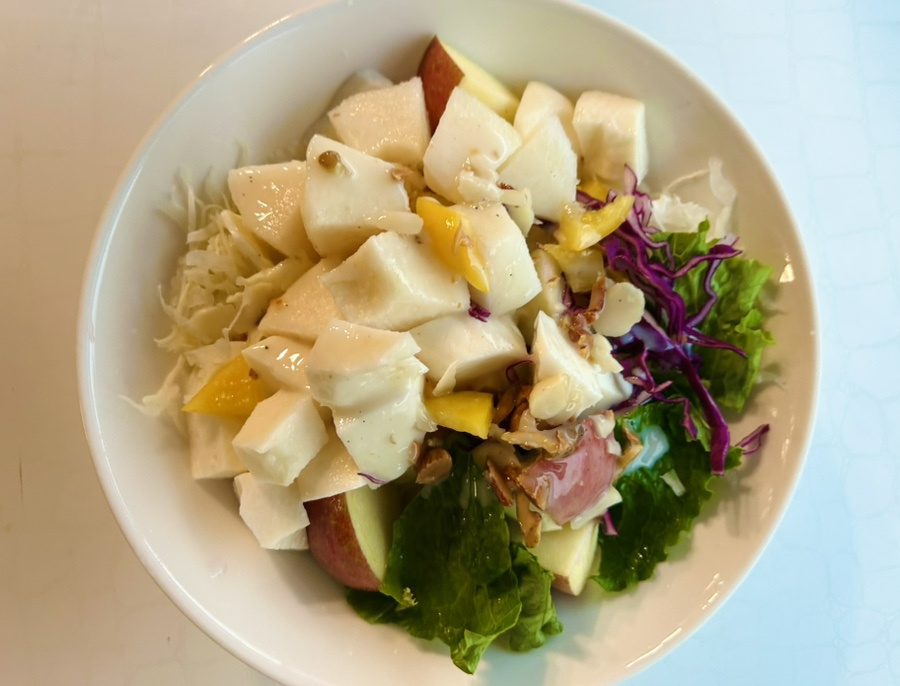 매일 먹어도 좋은 마와 사과와 신선한 야채들로 만든 샐러드에 고소한 견과류와 달콤 새콤한 허니 레몬 요거트 소스를 더해서 상큼한 아침식사 대용으로 다이어트 요리로 건강한 요리로도 넘 좋은 레시피예요.