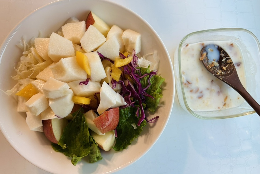 산마와 사과 ,배, 상추, 양배추등 냉장고에 있는 야채들을 이용해서 샐러드 재료를 준비했고 드레싱으로는 허니 레몬 요거트 소스를 만들어 상큼함을 더했어요.