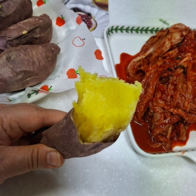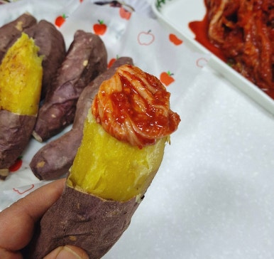 엄마가 삶아준 고구마에 김치를 올려서