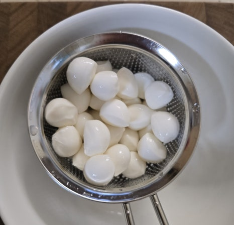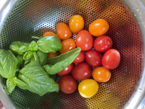 탱글탱글한 방울토마토 하나, 그 옆에 치즈 하나, 그리고 바질 잎 한 장.