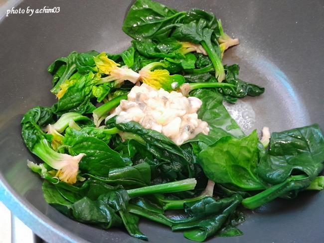 섬초바지락살볶음 겨울 나물반찬 시금치볶음 입니다