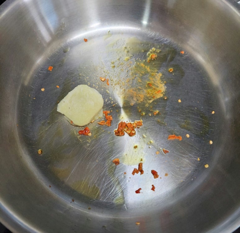 6. 달군 팬에 올리브오일 1t 정도 넣고, 다진 마늘 1T, 으깬 페퍼론치노 넣고 살짝 볶기. (약불.1분 정도 )