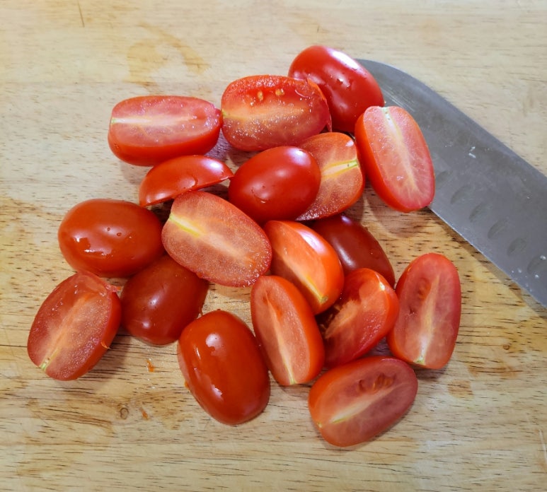 5. 토마토 썰기. 물이 덜 나오게~ 꼭지 부분의 오목한 부분을 기준으로 썰기.