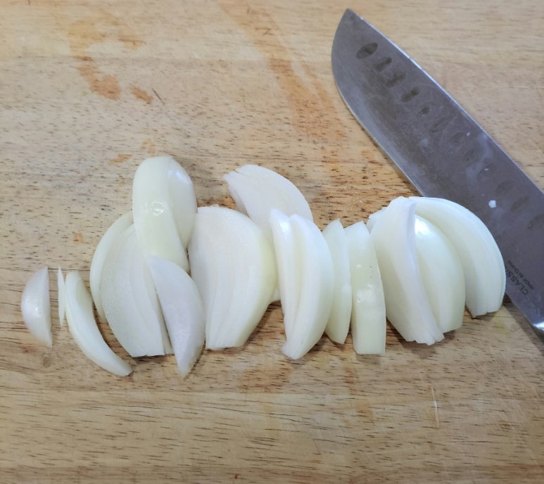 4. 양파 썰기. 1cm 정도 폭. 길쭉하게.