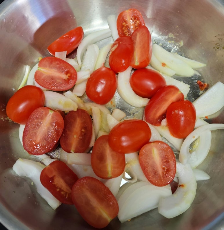 7. 양파를 바닥에 먼저 깔고, 방울토마토를 위에 모두 올리기.