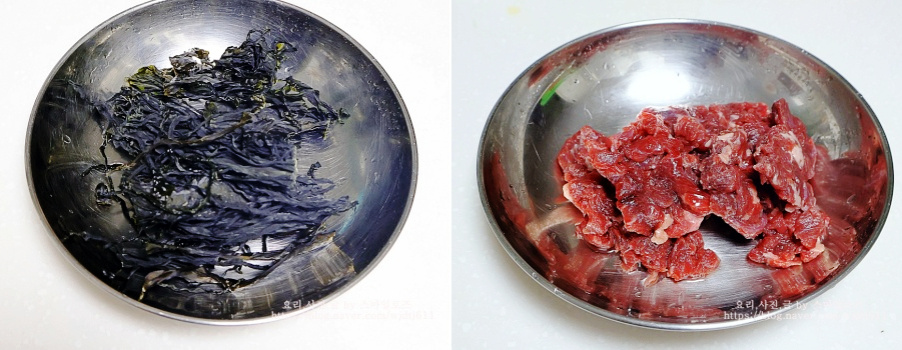 건미역과 소고기 국거리용 준비한 다음 미역은 물에 담가 불려주고