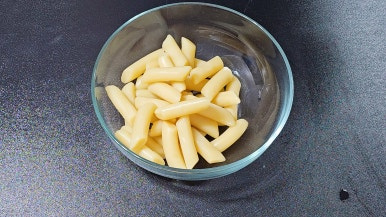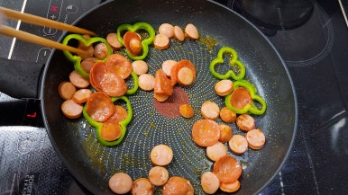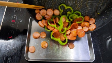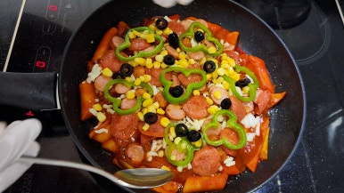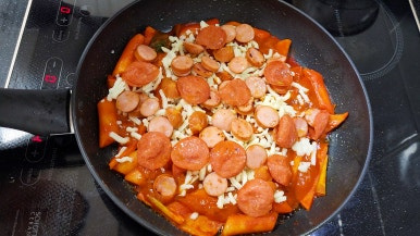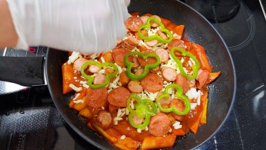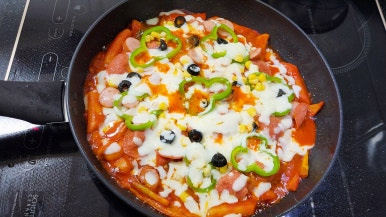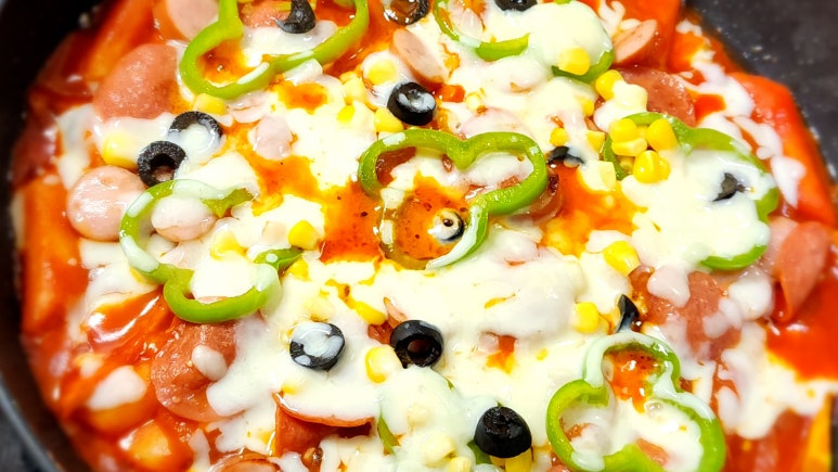 밀 떡볶이떡 350 g , 사각어묵 3 장 , 대파 1 대 , 고추장 듬뿍 2 T , 고운고춧가루 2 T , 진간장 2 T , 설탕 듬뿍 2 T , 물 400 ml , 청피망 1/2 개 , 비엔나소시지 5 개 , 스위트콘 , 블랙올리브 , 페퍼로니 , 토마토소스 150 g , 모차렐라 치즈 2 팩 (150g), 식용유(아보카도유)