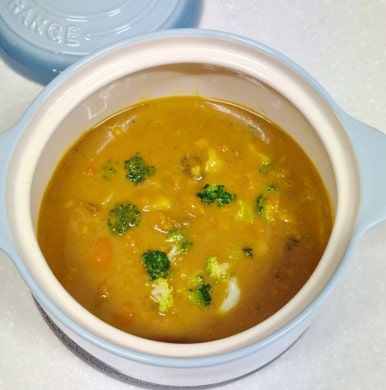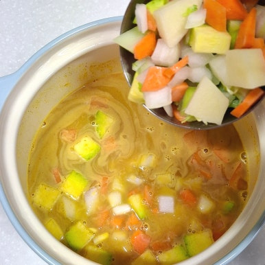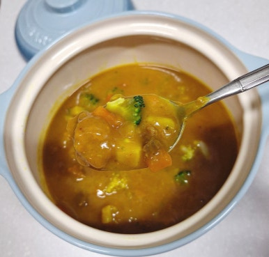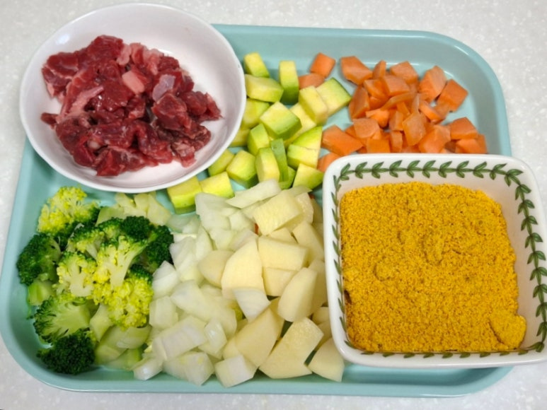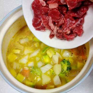 감자 반컵 , 당근 반컵 , 애호박 반컵 , 브로콜리 반컵 , 양파 반컵 , 소고기 반컵 , 카레가루 8T , 물 3컵