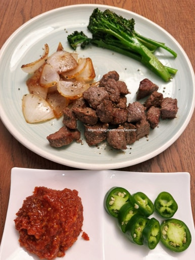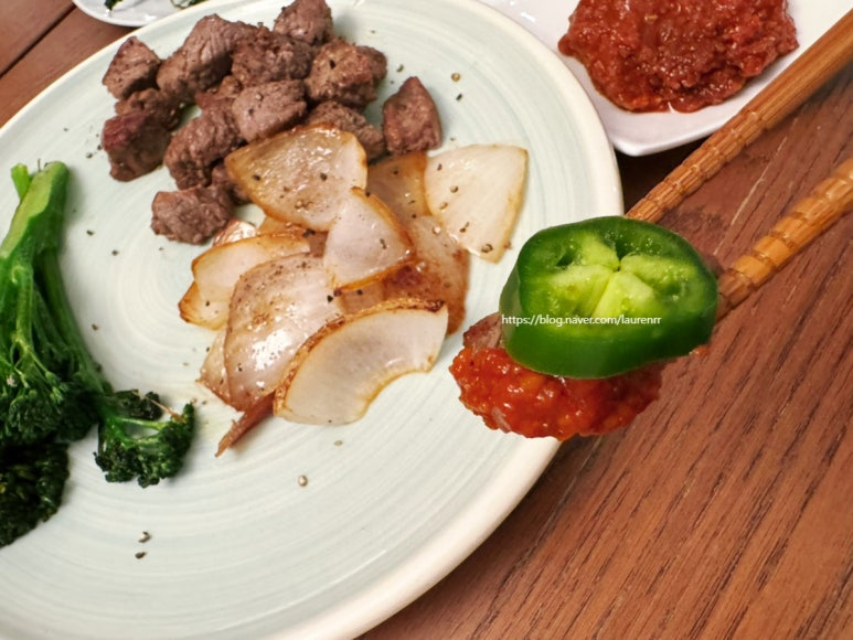 설로인 2덩어리 , 양파 1/2개 , 브로콜리 적당히 , 올리브 오일 조금 , 소금 조금 , 후추 조금 , 쌈장 조금 , 할라피뇨 1개