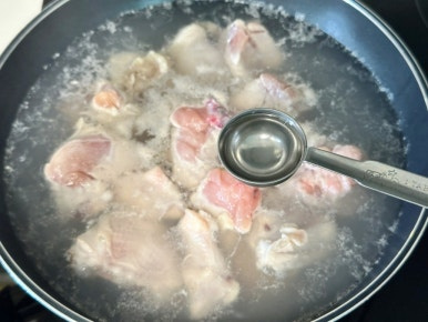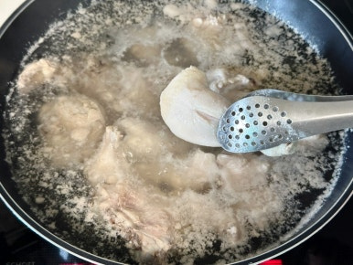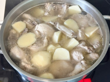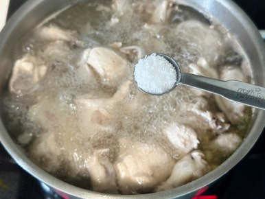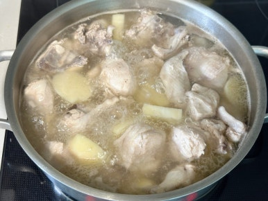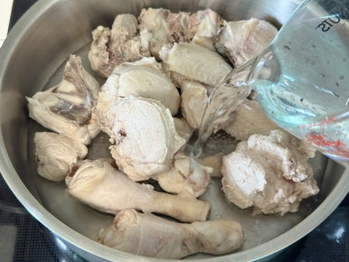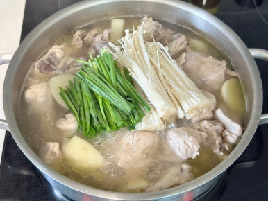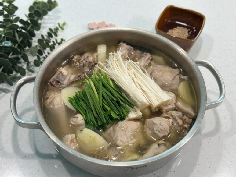 닭고기 1마리 , 감자 3개 , 부추 한줌 , 팽이버섯 1/2개 , 물 1L , 맛술 1T , 코인육수 1개 , 소금 1t