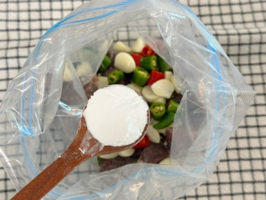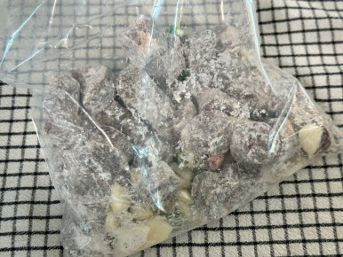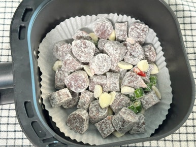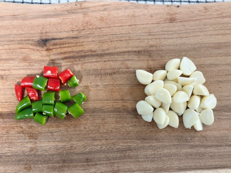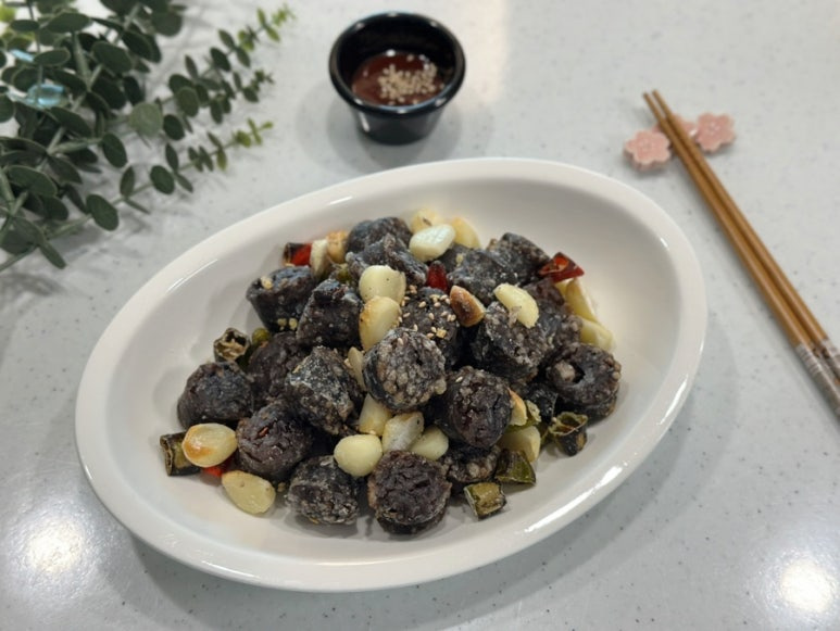냉장순대 1팩 , 마늘 15개 , 청양고추 3개 , 올리브유 1T , 전분가루 1T , 후추 0.5t