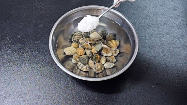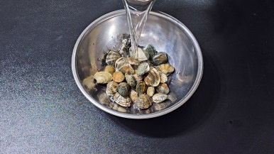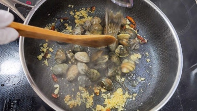 바지락 400 g , 파스타면 150 g , 깐마늘 6 알 , 페페론치노 7 알 , 소주 (60ml) 1 컵 (소주컵), 물 600 ml , 소금 3 꼬집 , 버터 20 g , 참치액 1/2 T , 올리브유 , 파슬리 , 후추