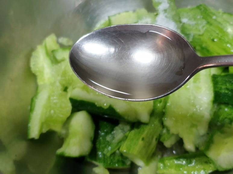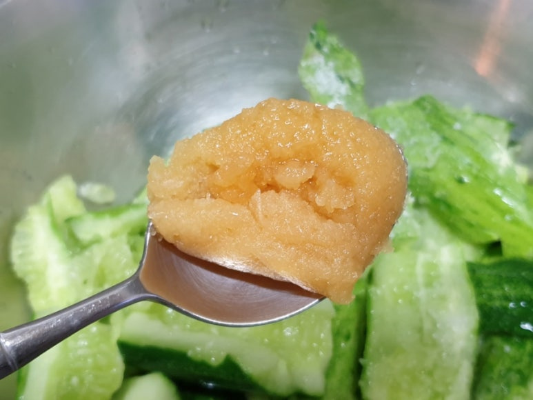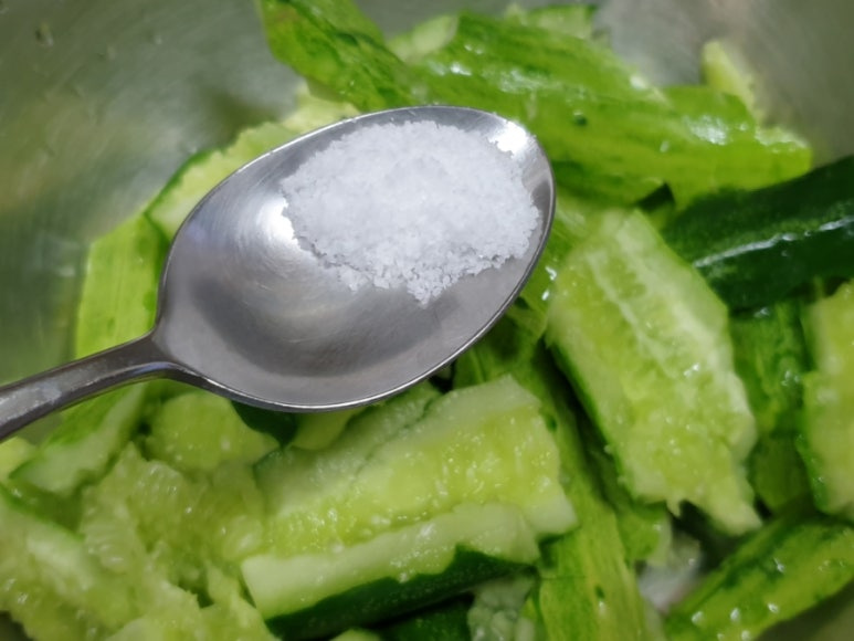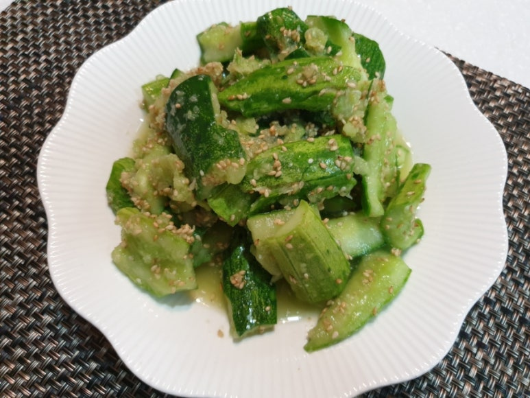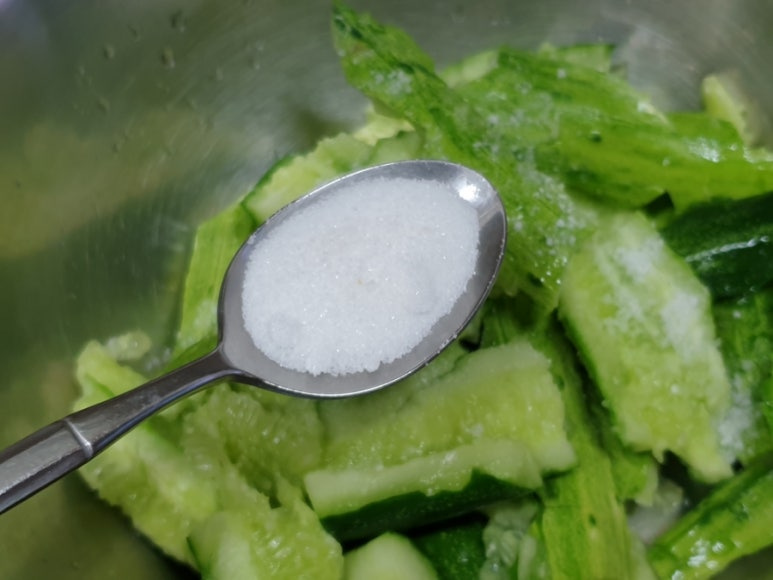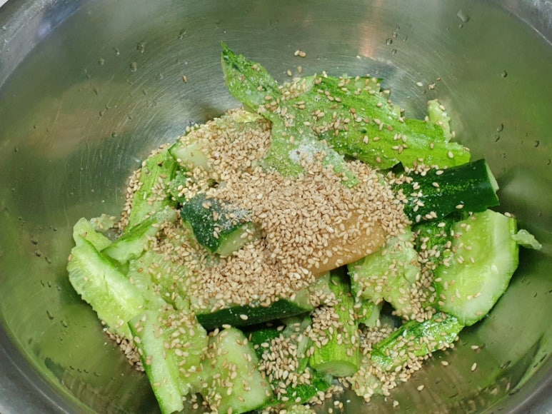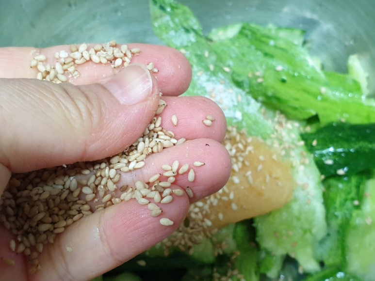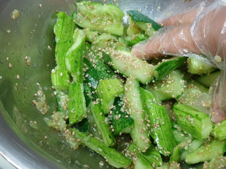 오이 2개 , 소금 1t , 설탕 2t , 식초 3 스푼 , 다진 마늘 1스푼 , 통깨 많이