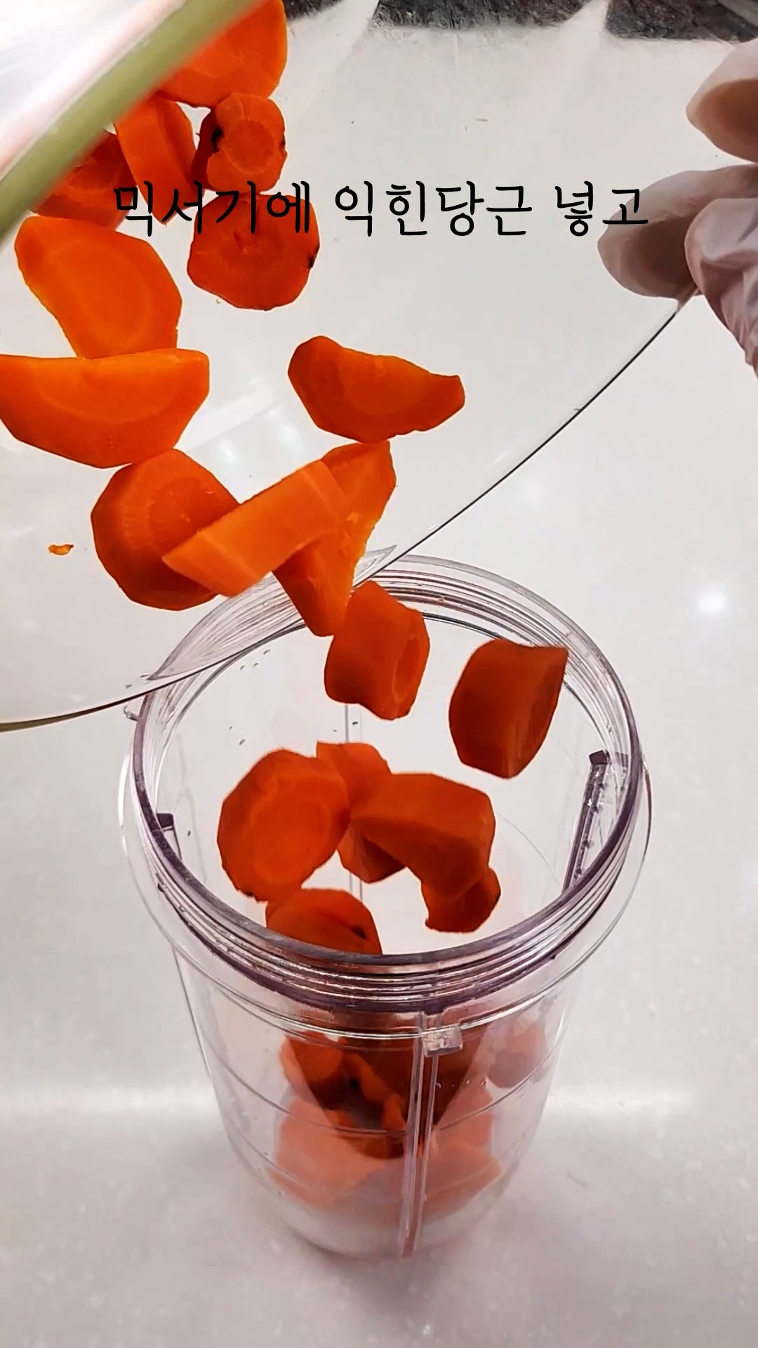 당근은 잘게 썰어 전자레인지에 돌리면 믹서기에 갈기 쉽게 익히는 데 도움이 됩니다. 스테비아와 소금을 조절하여 본인 입맛에 맞게 조절하세요.