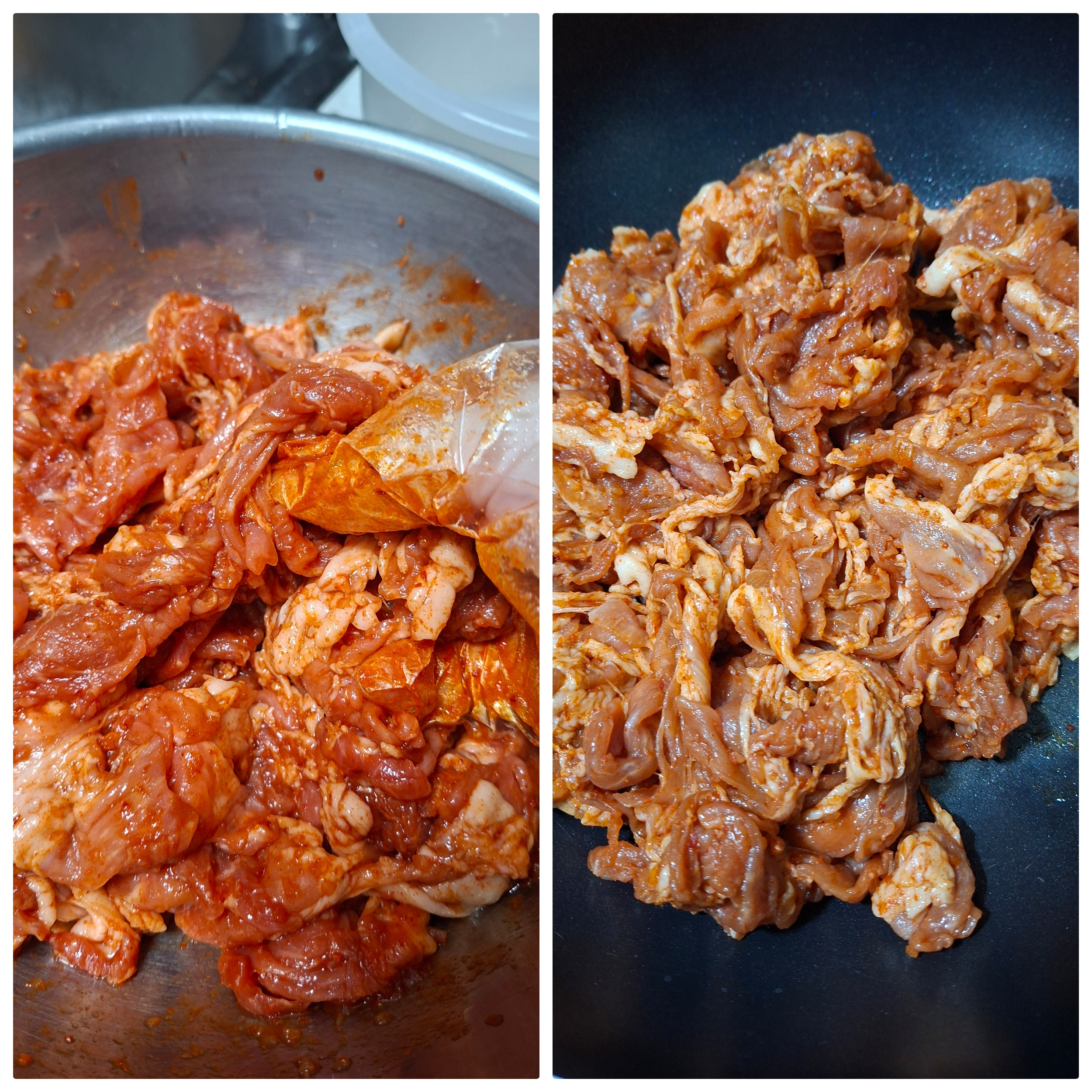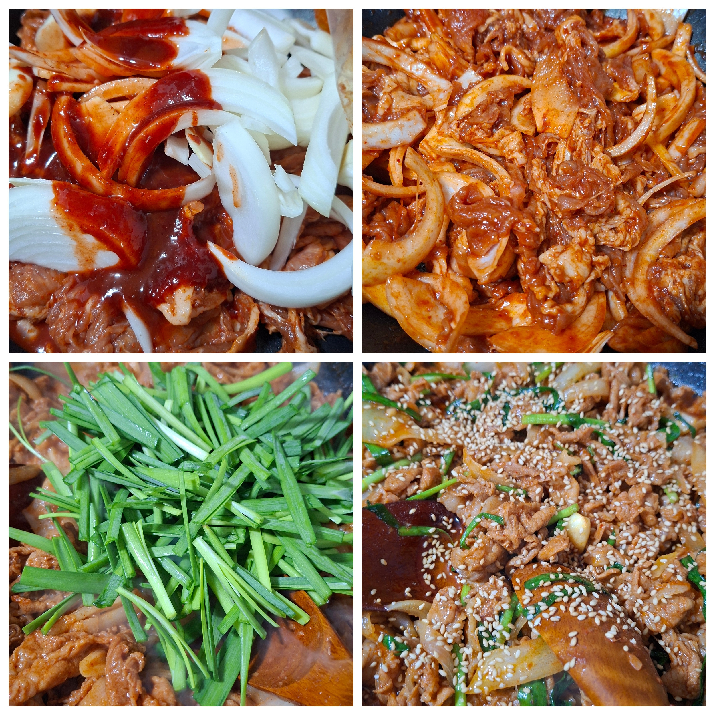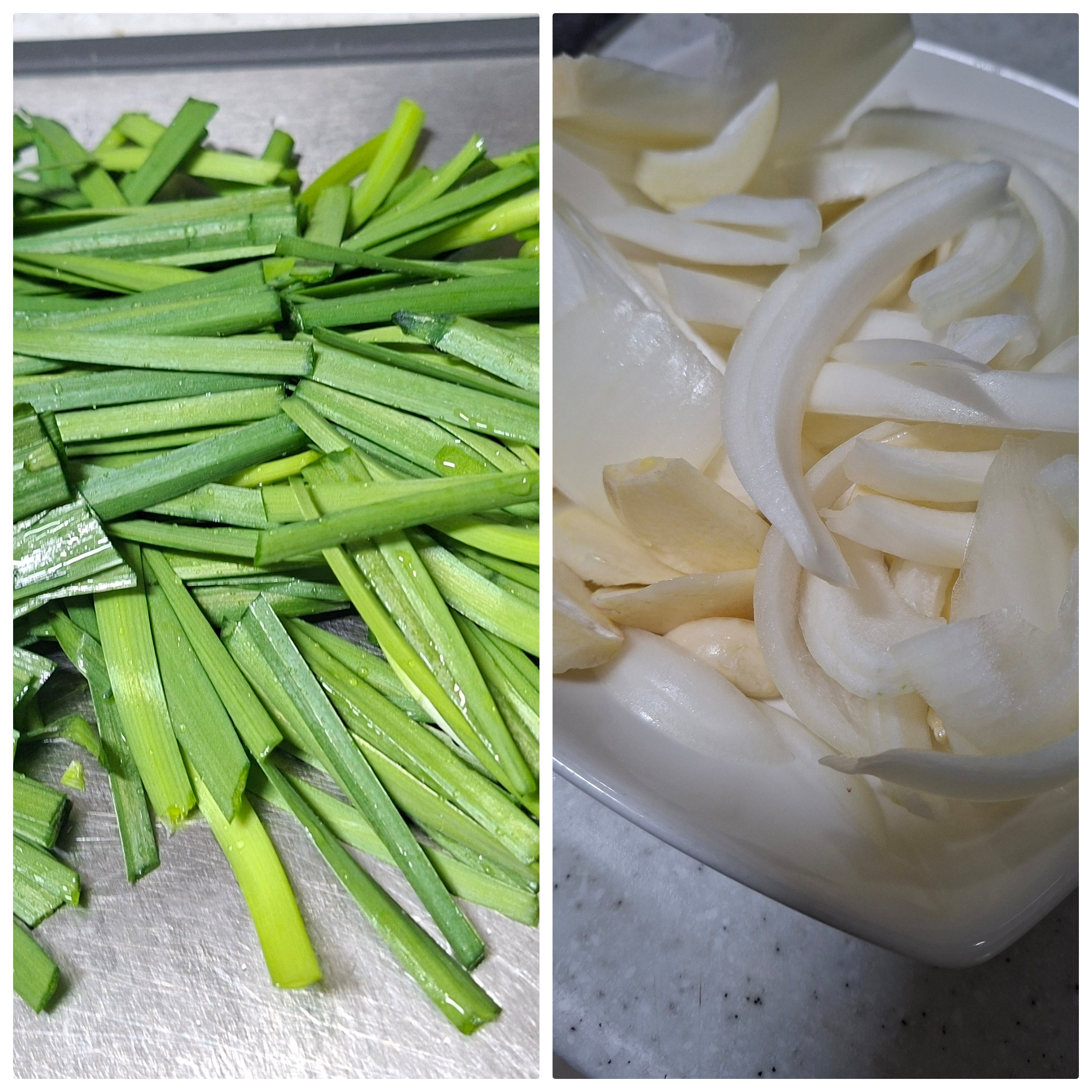 돼지앞다리살을 냉동으로 얇게 썰어진것을 준비후에 시판용소스를 넣고 부추를 추가해서 간단하게 제육볶음을 만들어봤어요
