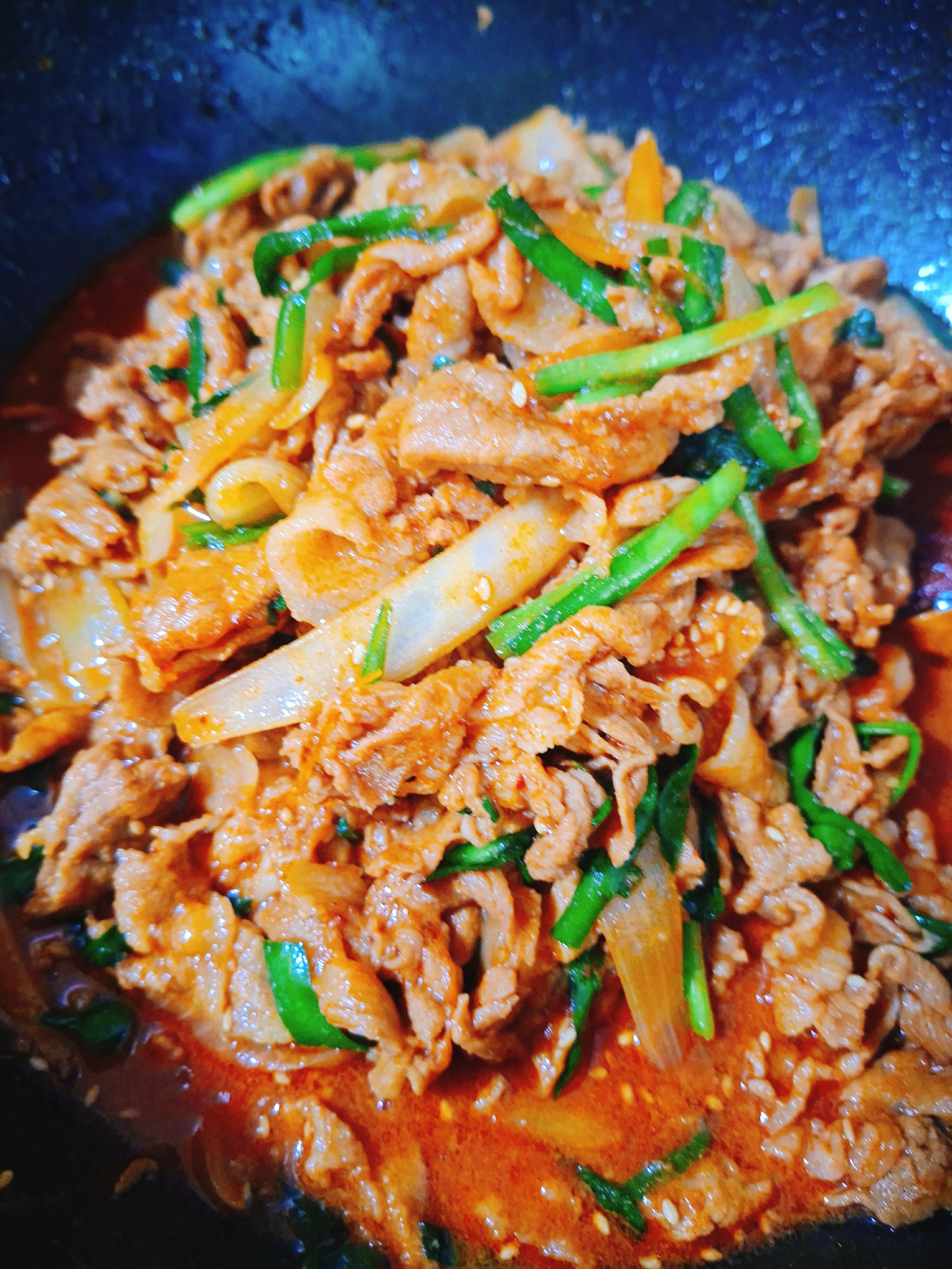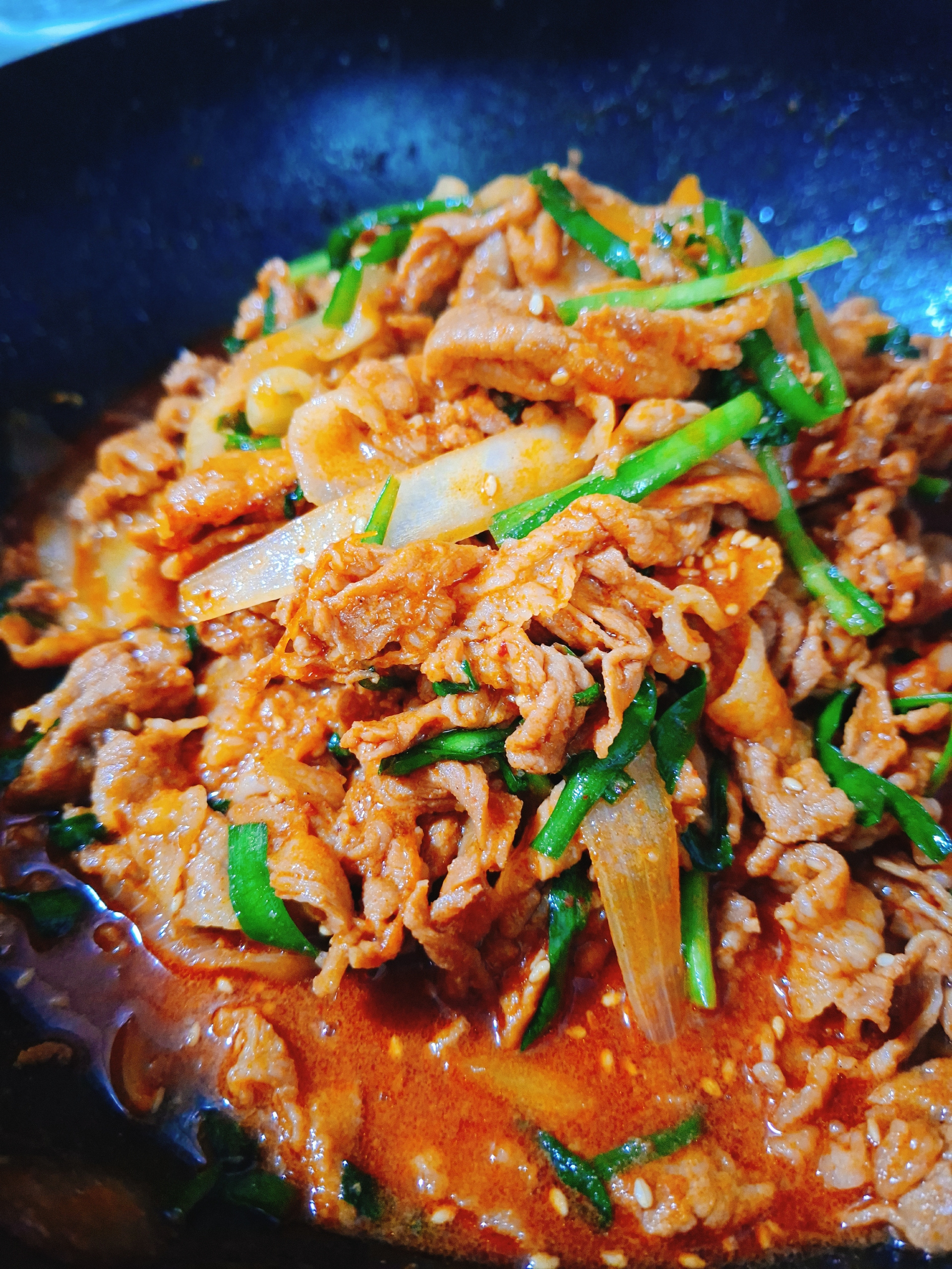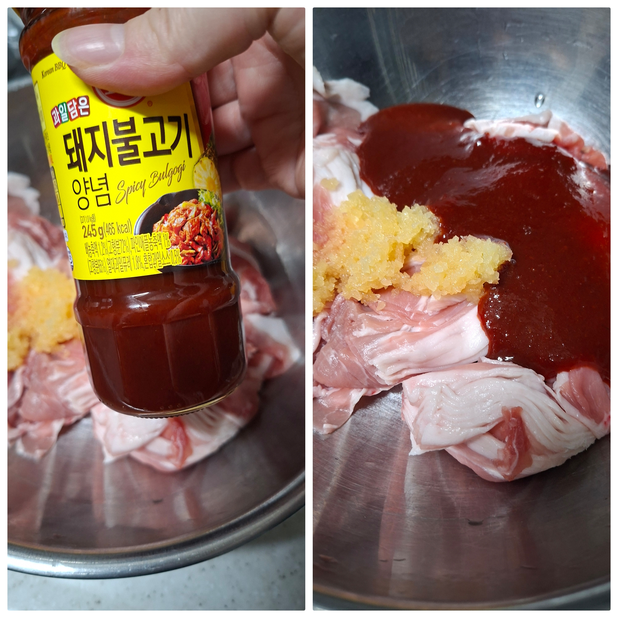 돼지앞다리살을 냉동으로 얇게 썰어진것을 준비후에 시판용소스를 넣고 부추를 추가해서 간단하게 제육볶음을 만들어봤어요
