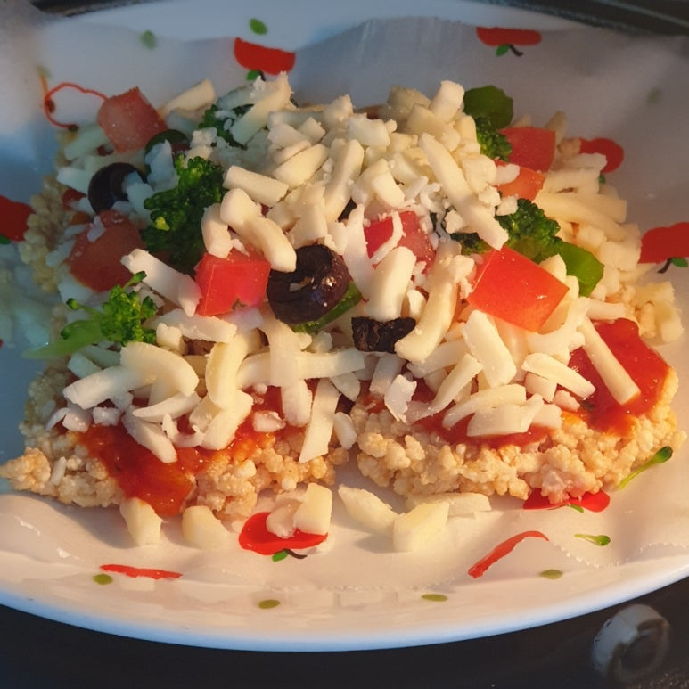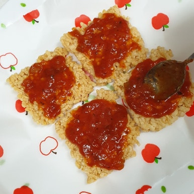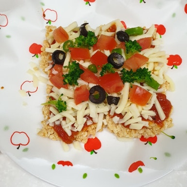 찹쌀누룽지과자 , 토마토소스 , 모짜렐라치즈 , 토마토 , 브로콜리 , 올리브