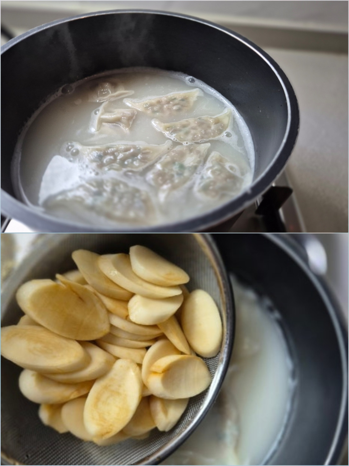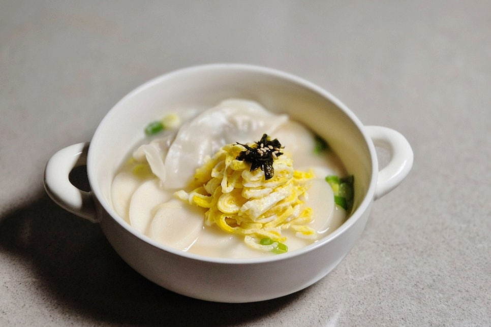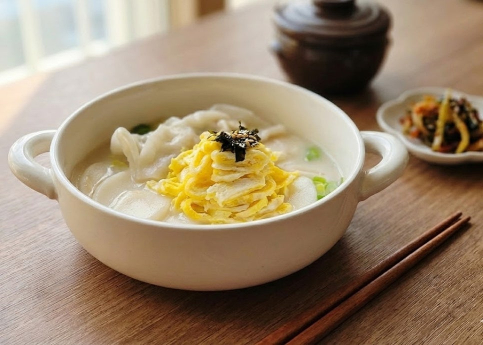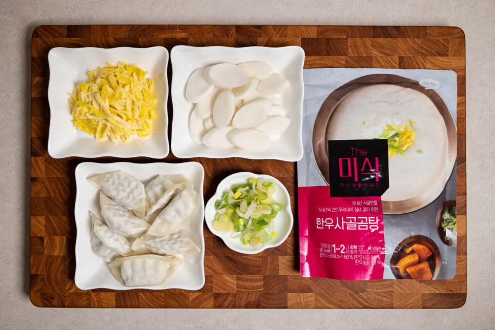 떡국떡 150g , 사골곰탕 500ml , 고향만두 7개 , 대파 1/3대 , 국간장 2T , 후추 톡톡 , 계란지단 (고명용), 김가루 (고명용)